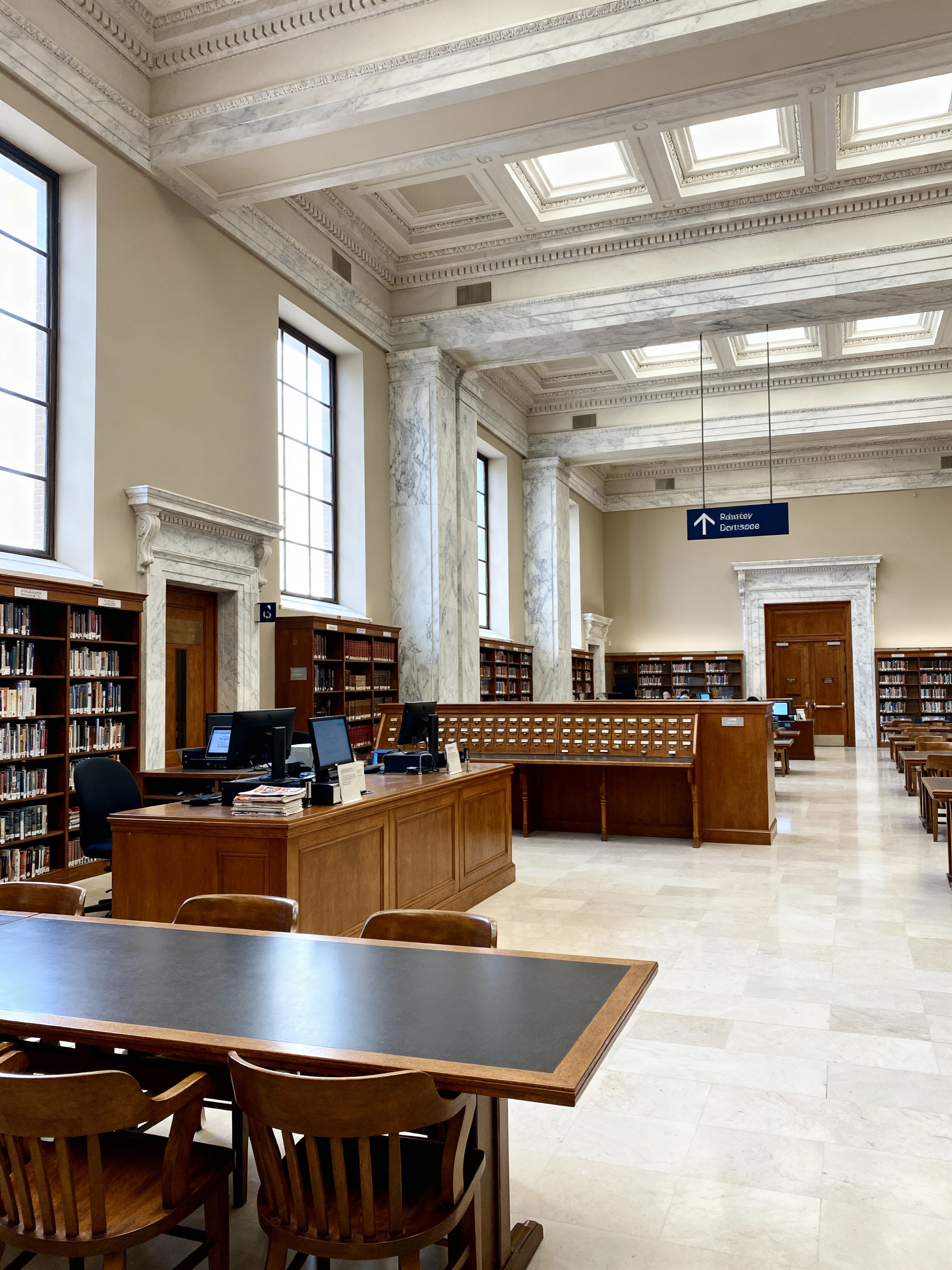 library with neoclassic style with periodicals and reading tables and checkout desk and card catalogs and bookshelves and computer terminals and quiet signs and chairs. . with thoughtful minimalism and classical architectural details and timeless furniture and geometric decorative elements and elegant and sophisticated and symmetric layouts and emphasized horizontal and vertical lines and spacious rooms