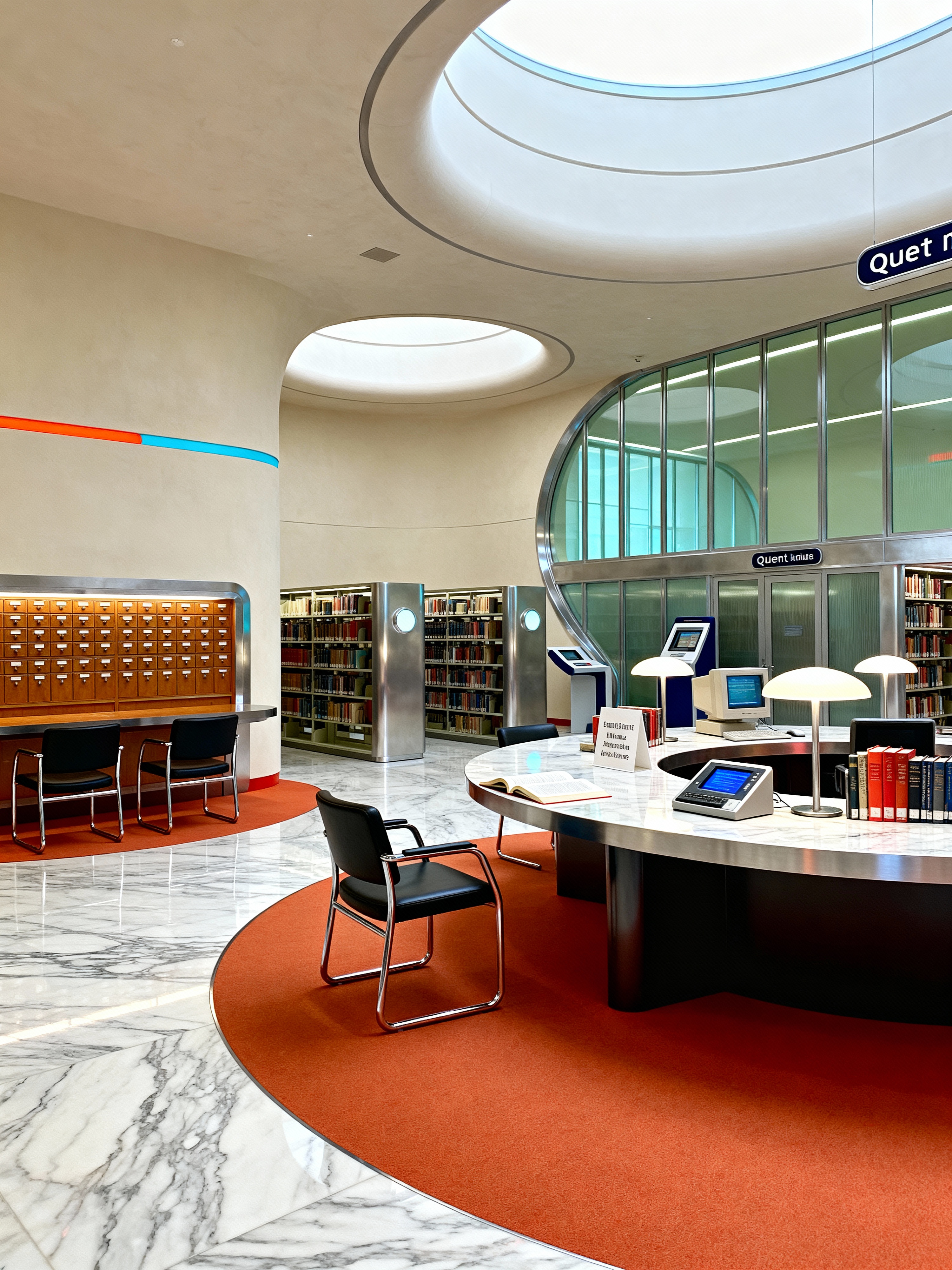 library with retro futuristic style with chairs and card catalogs and bookshelves and quiet signs and reading tables and study lamps and computer terminals and reference books. . with minimalist clean lines and smooth polished marble and circular shapes and steel finishing and neutral background and bright accents and futuristic interior and glass panes and futurism minimalist interior