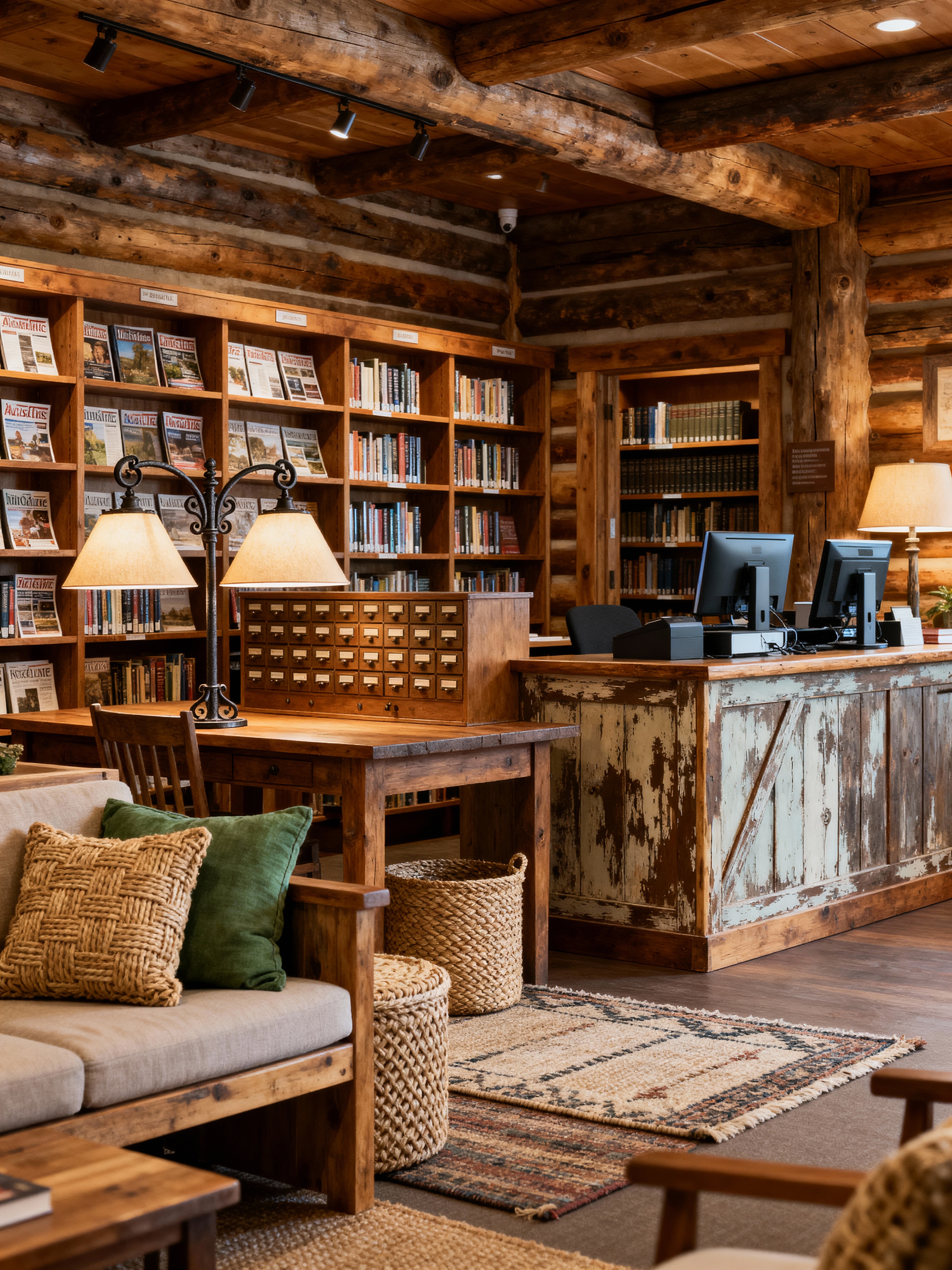 library with rustic style with bookshelves and periodicals and study lamps and card catalogs and computer terminals and checkout desk and reference books and reading tables. . with natural wood and warmth and woven textures and distressed finishes and country style and iron fixtures and cozy cabin and earthy tones