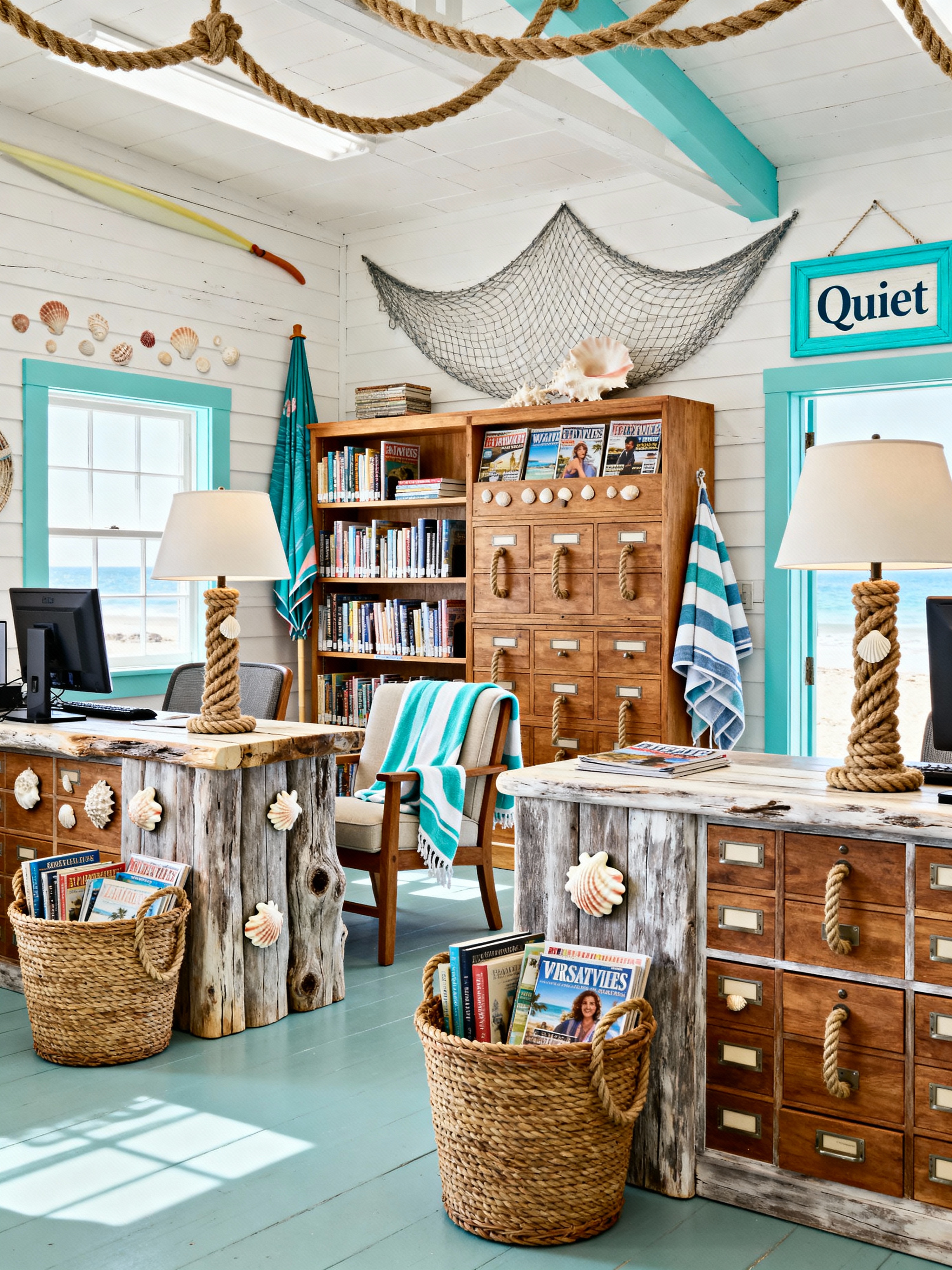 library with surf shack style with periodicals and chairs and reference books and study lamps and quiet signs and checkout desk and computer terminals and card catalogs. . with rope details and white-washed walls and nautical rope and beach towels and seashells and net decorations and beach umbrellas and turquoise accents