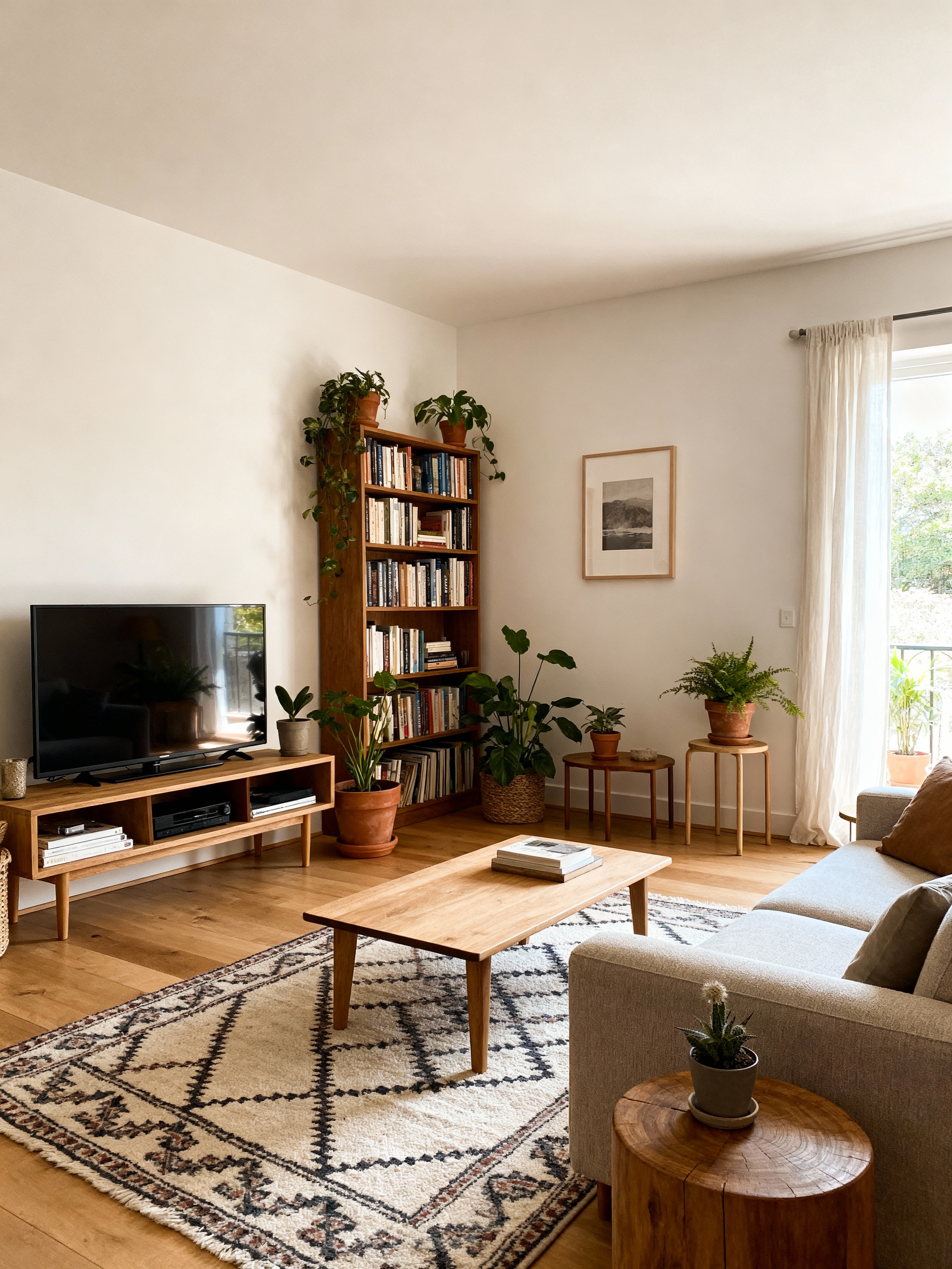 living room with airbnb style with televisions and rug and furniture and bookshelves and plant and sofa and coffee tables and occasional tables. . with practicality and functionality and simple, clean lines and simplistic furniture and open and natural lighting and scandinavian style and simple color palette and neutral walls and textures and natural materials and elements and practicality and functionality