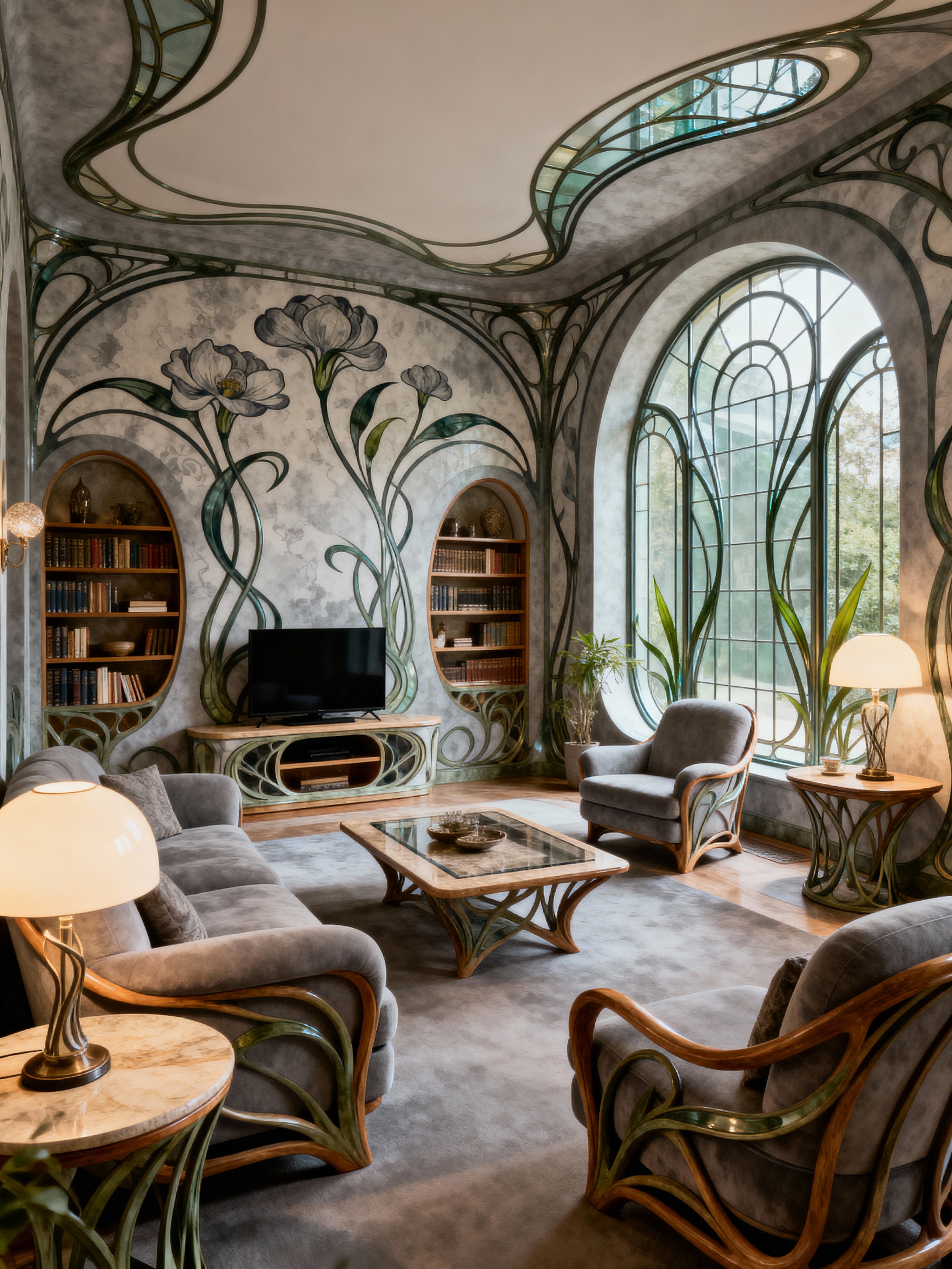 living room with art nouveau style with chairs and coffee tables and televisions and sofa and electric lamps and bookshelves and furniture and occasional tables. . with curving, plant-like embellishments and soft, rounded lines and curved glass and wallpaper patterns of stylized flowers and ashy colors and arches and curved forms and natural materials and asymmetrical shapes