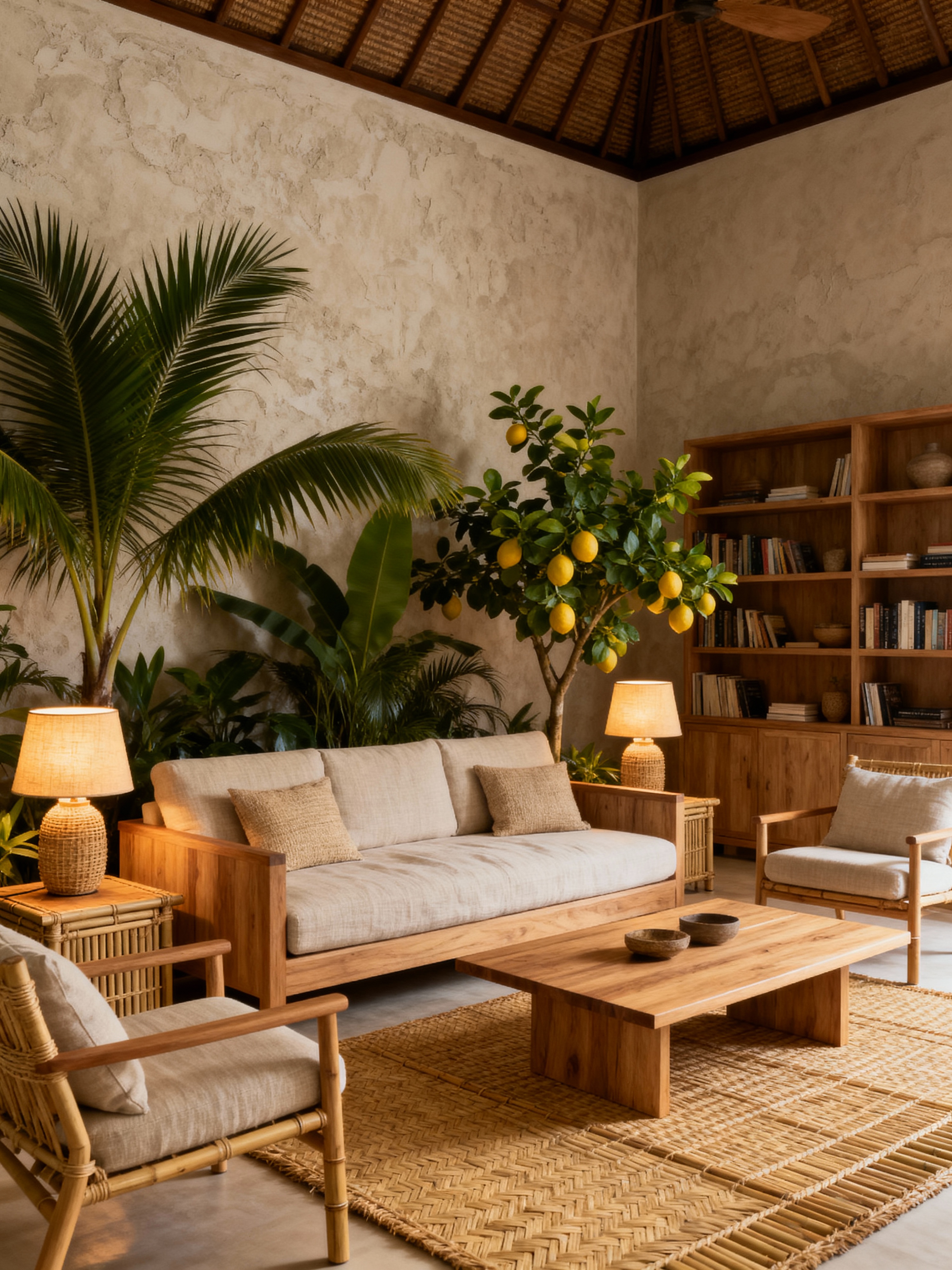 living room with bali style with rug and electric lamps and plant and sofa and bookshelves and coffee tables and furniture and chairs. . with raffia or bamboo accents and light wood furniture (teak, oak) and lush tropical plants (palms, lemon trees) and modern boho chic and linen or cotton fabrics and warm ambient lighting and calm, minimal, tropical atmosphere and textured plaster or stucco finish