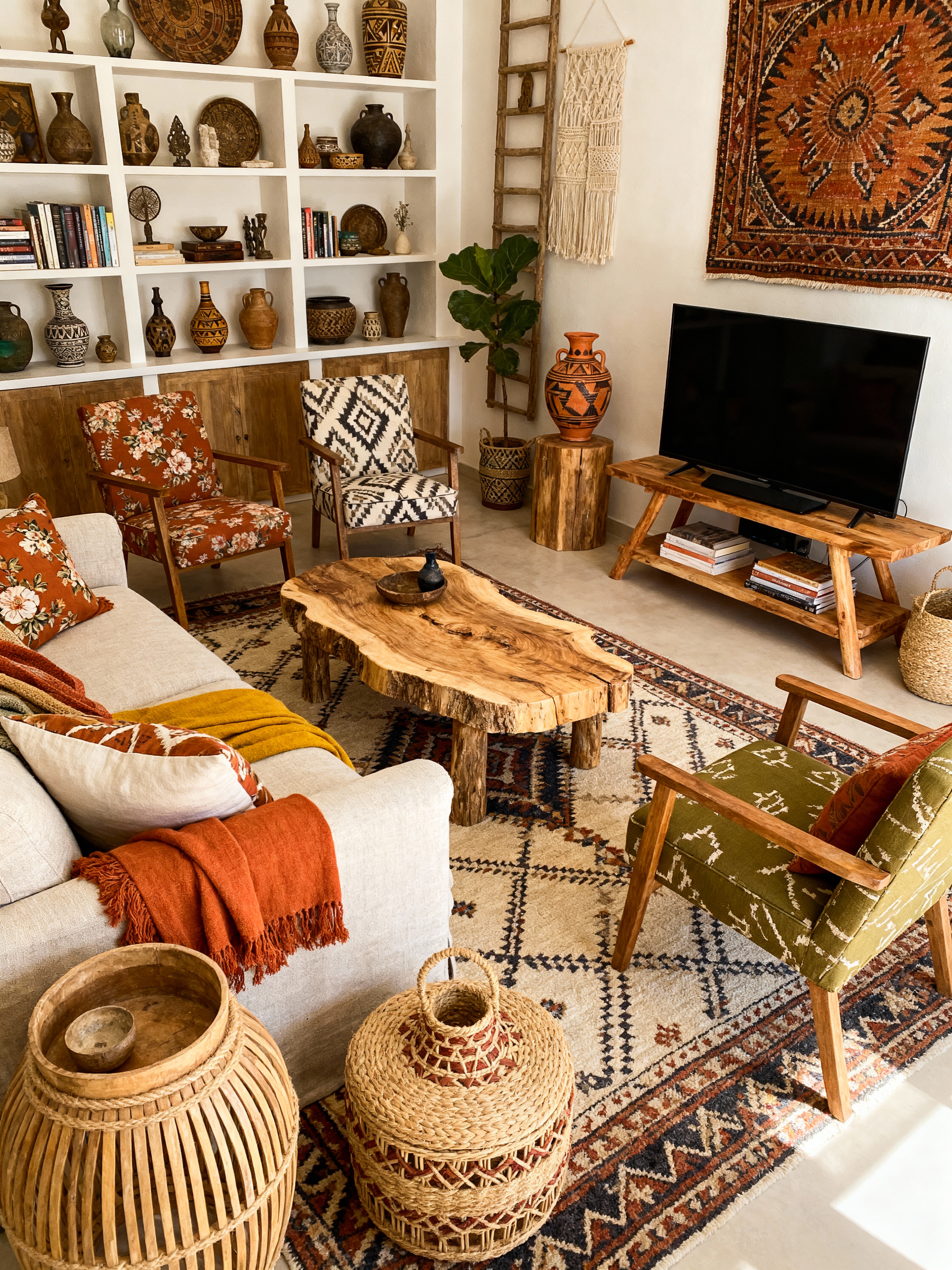 living room with boho-chic style with sofa and plant and chairs and coffee tables and televisions and furniture and rug and bookshelves. . with layered textiles and natural materials and earthy colors and mixed patterns and eclectic mix and global artifacts and relaxed atmosphere and bohemian flair