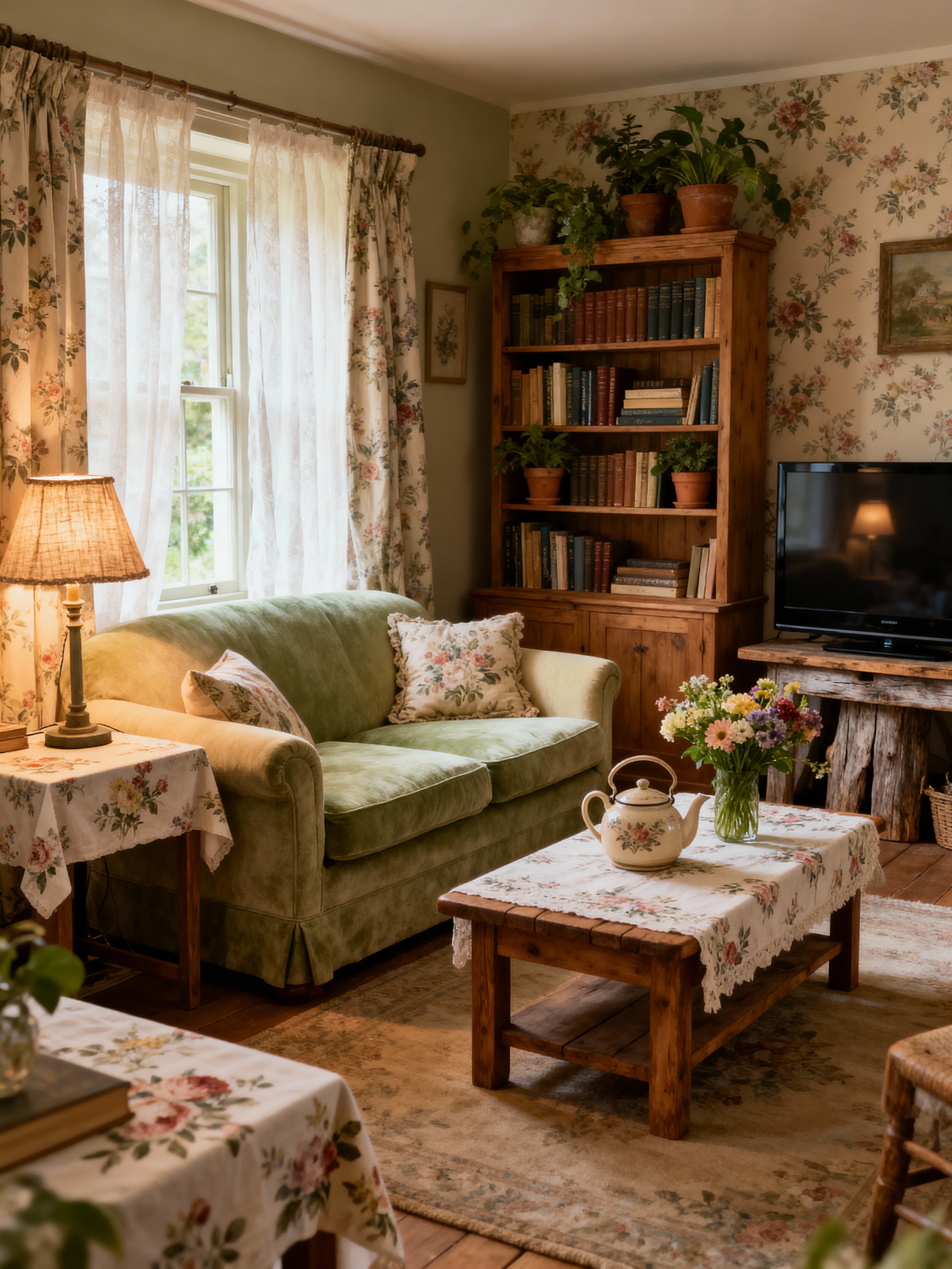 living room with cottagecore style with plant and sofa and electric lamps and televisions and furniture and occasional tables and bookshelves and coffee tables. . with rustic and traditional and earthy and cottage style and muted colors and natural and organic and floral patterns