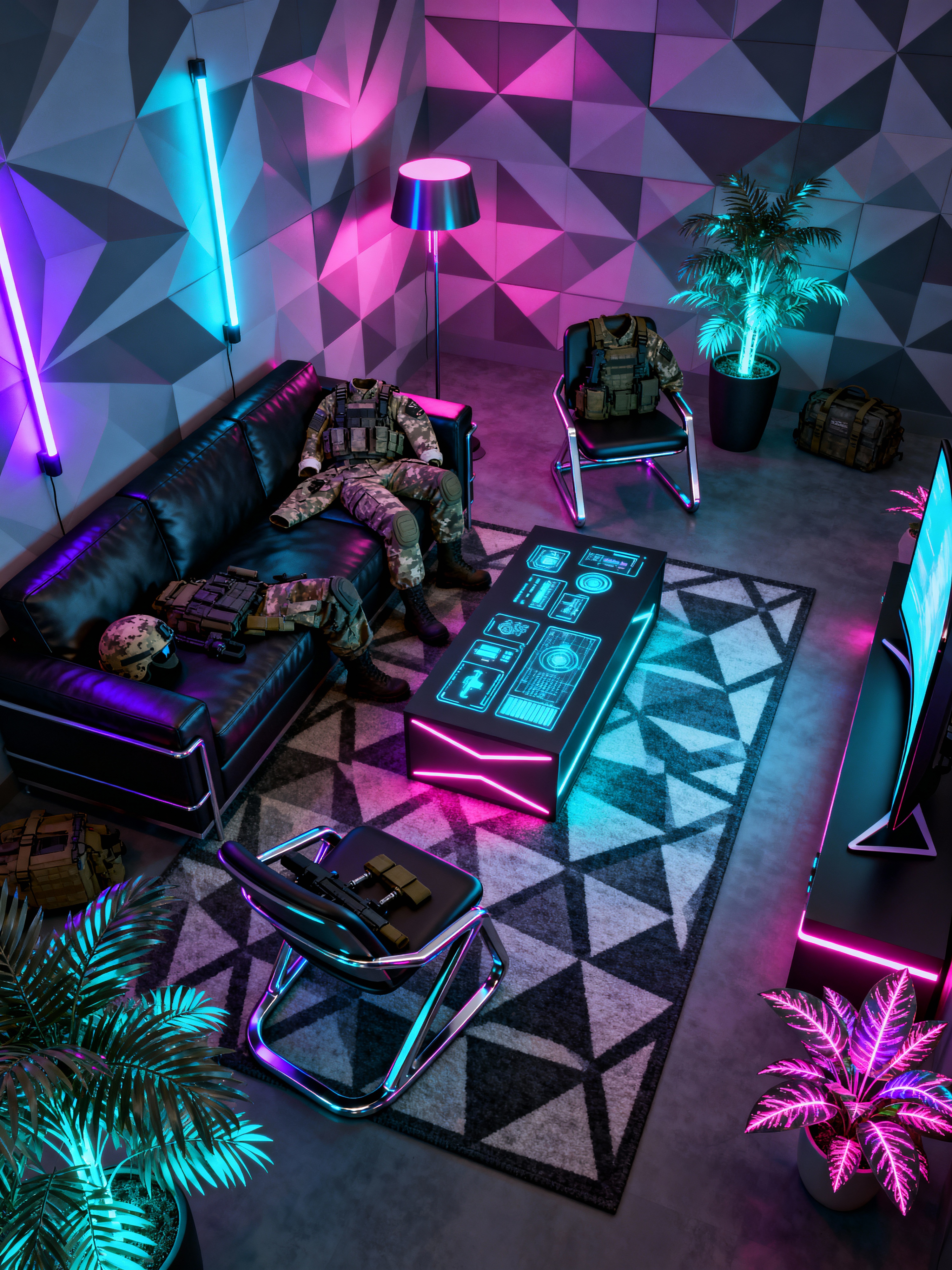 living room with cyberpunk style with sofa and electric lamps and rug and chairs and plant and coffee tables and furniture and televisions. . with bladerunner lights and color lights glow and strong geometric walls and bladerunner style and cyberpunk lights and futuristic cybernetic details and military uniforms and gear and synthwave