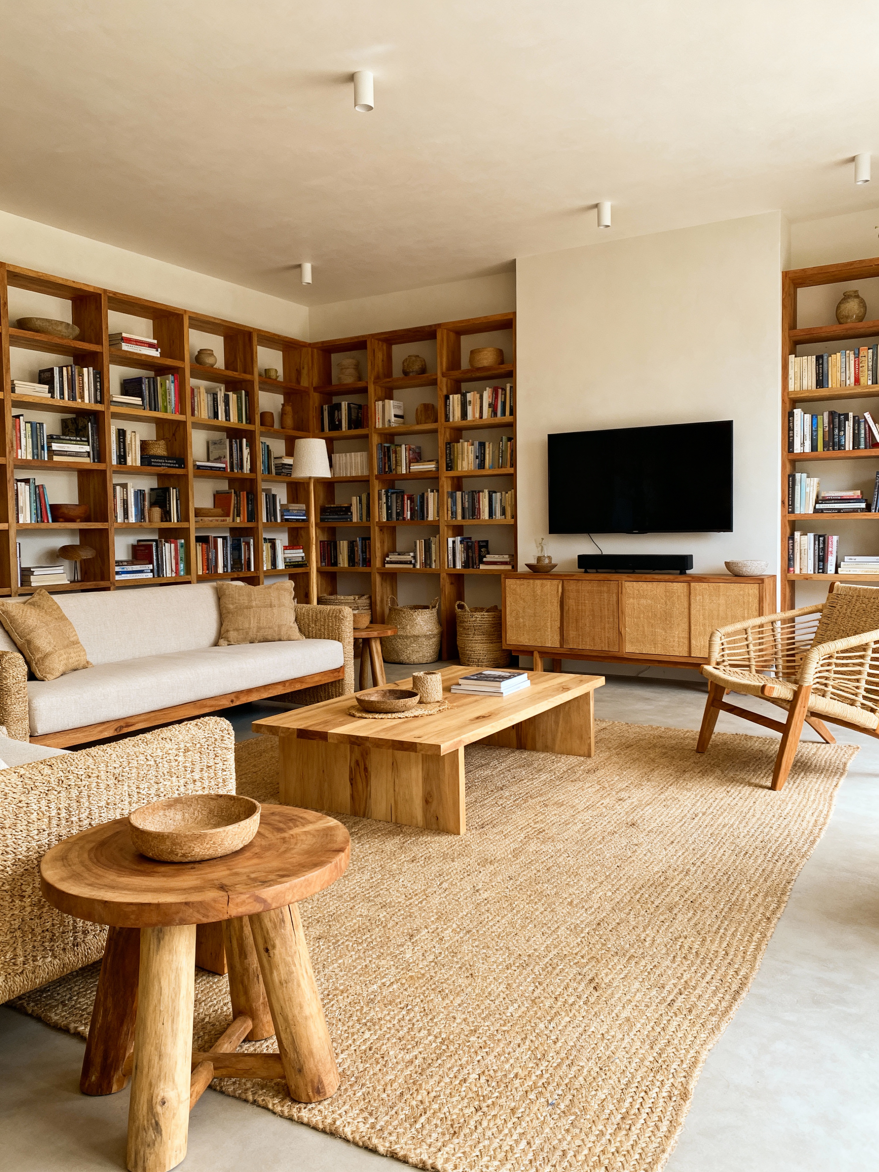 living room with eco-friendly style with bookshelves and rug and coffee tables and furniture and sofa and chairs and televisions and occasional tables. . with natural fibers and non-toxic finishes and recycled elements and environmentally conscious and renewable resources and energy efficient and green living and sustainable materials