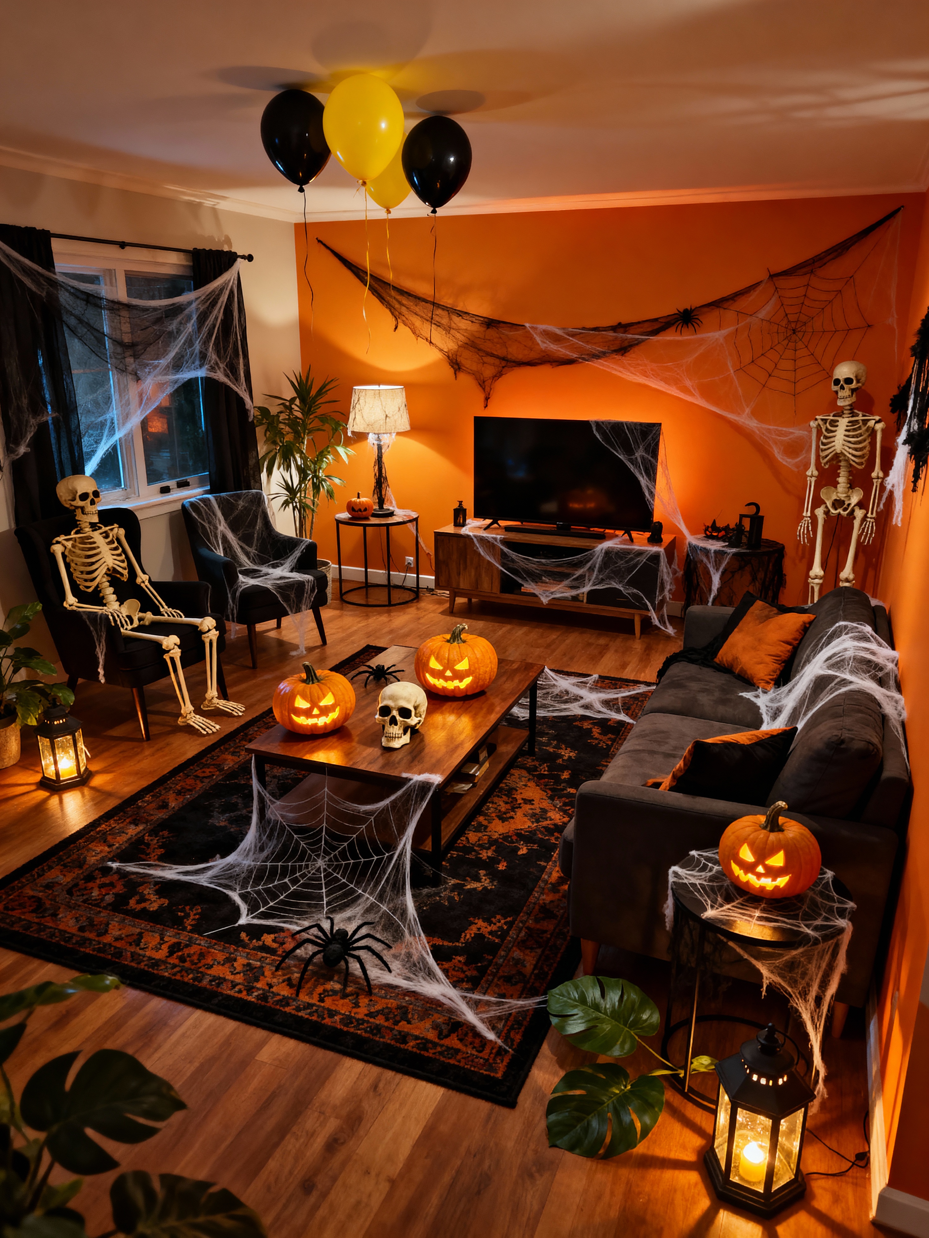 living room with halloween style with chairs and sofa and coffee tables and rug and televisions and furniture and occasional tables and plant. . with cobwebs and glowing pumpkins and cobwebs and lanterns and skeletons sitting and standing and yellow black balloons and human skulls and spiderwebs