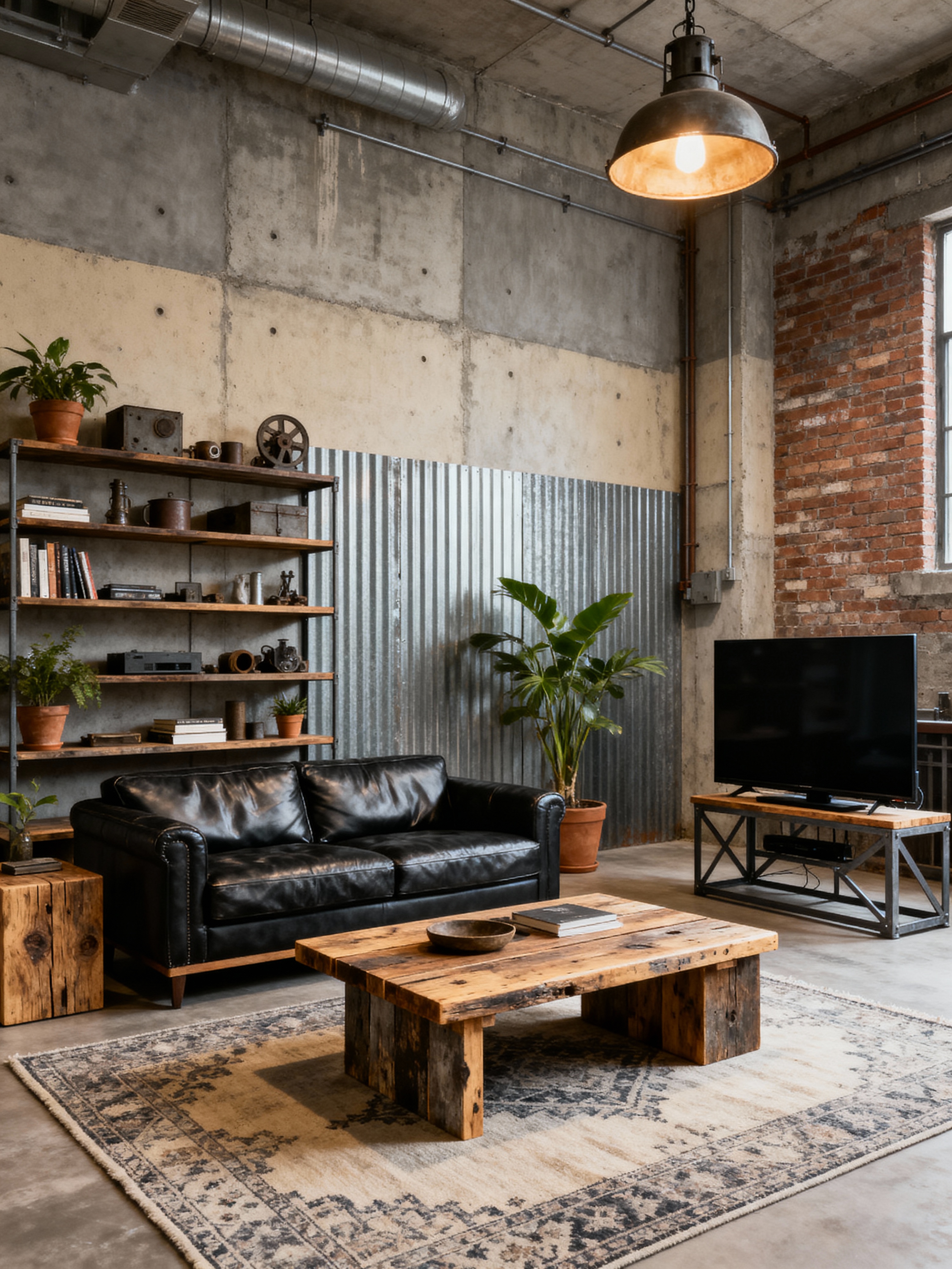 living room with industrial style with coffee tables and occasional tables and sofa and bookshelves and plant and rug and furniture and televisions. . with exposed concrete and factory style and utilitarian objects and raw aesthetic and neutral tones and exposed brick and metal panels and reclaimed wood