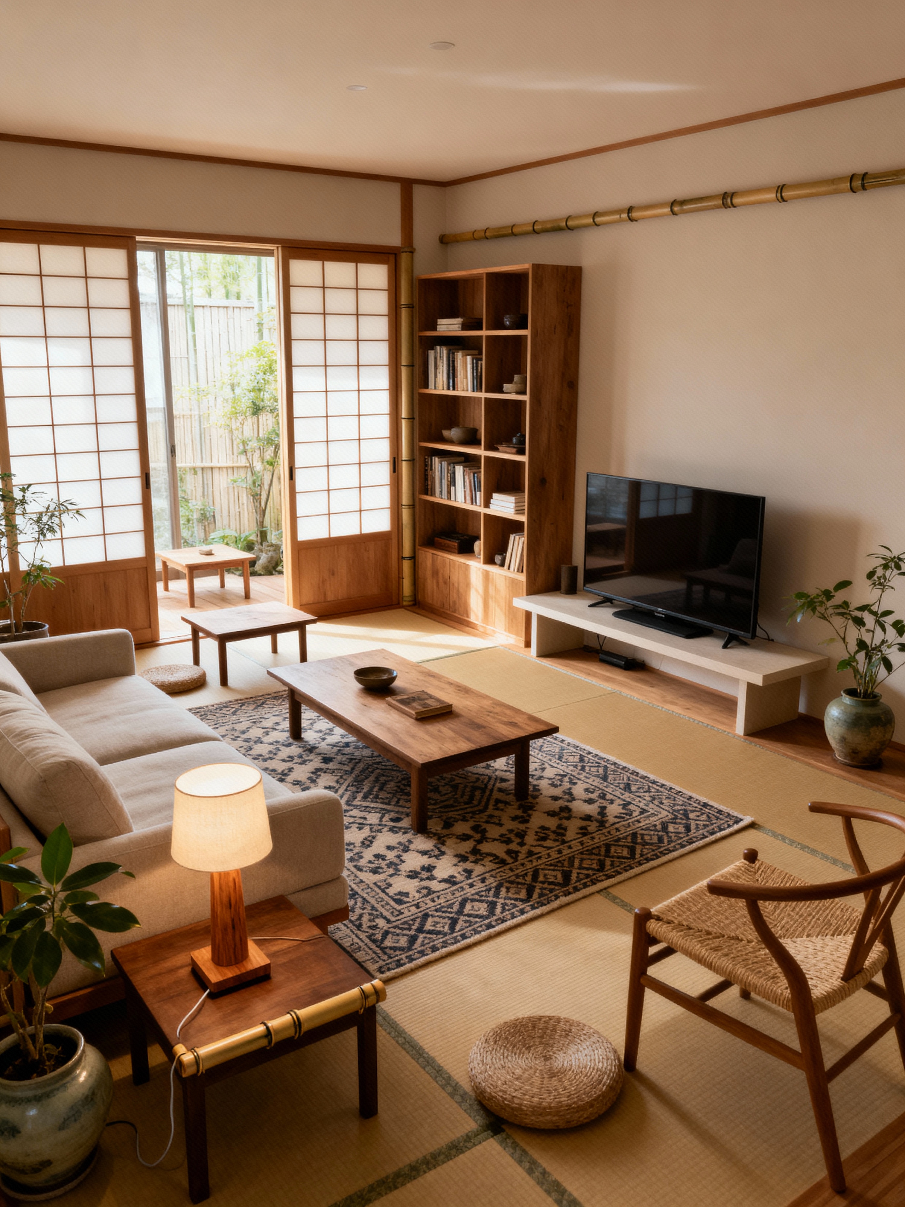 living room with japanese design style with televisions and sofa and bookshelves and rug and occasional tables and chairs and plant and electric lamps. . with low furniture and indoor plants and bamboo accents and neutral colors and wabi-sabi and minimalism and sliding doors and tranquility