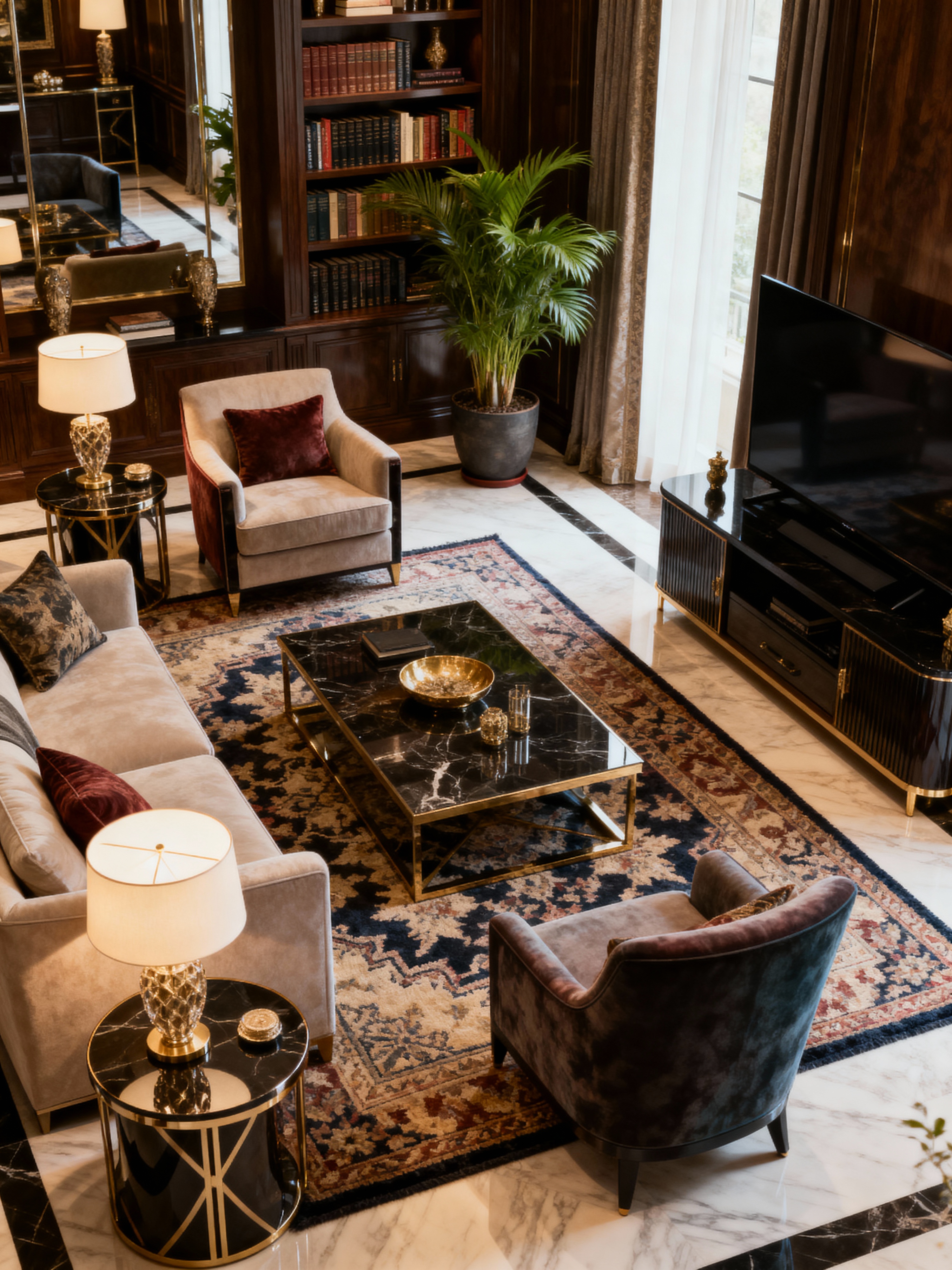 living room with luxury style with plant and coffee tables and rug and bookshelves and occasional tables and electric lamps and furniture and televisions. . with premium finishes and designer furniture and sophisticated style and custom pieces and exclusive design and expensive fabrics and rich textures and lavish comfort