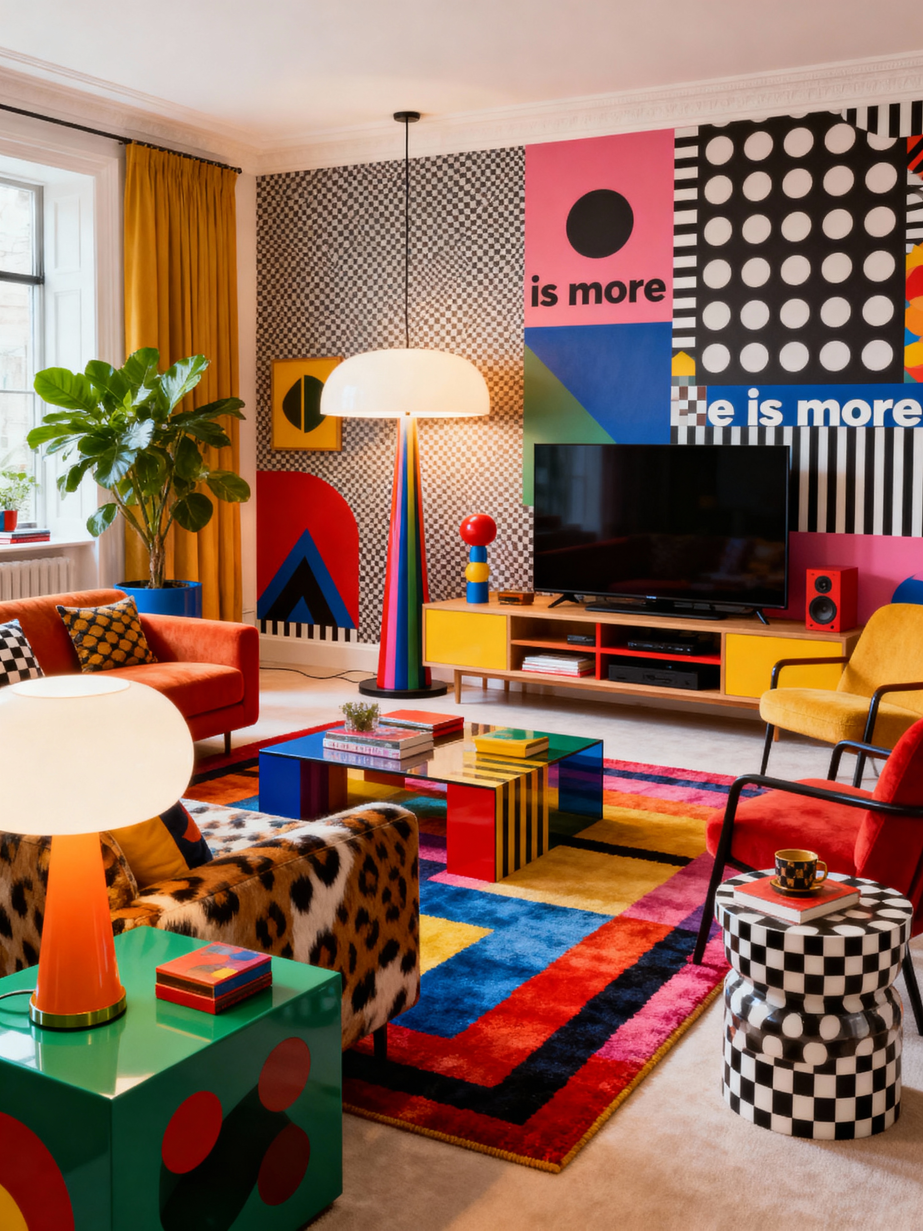 living room with maximalist style with electric lamps and televisions and sofa and furniture and chairs and rug and plant and occasional tables. . with bold creativity and bold colors and over-the-top aesthetic and bold patterns and more is more philosophy and bold design and playful and vibrant