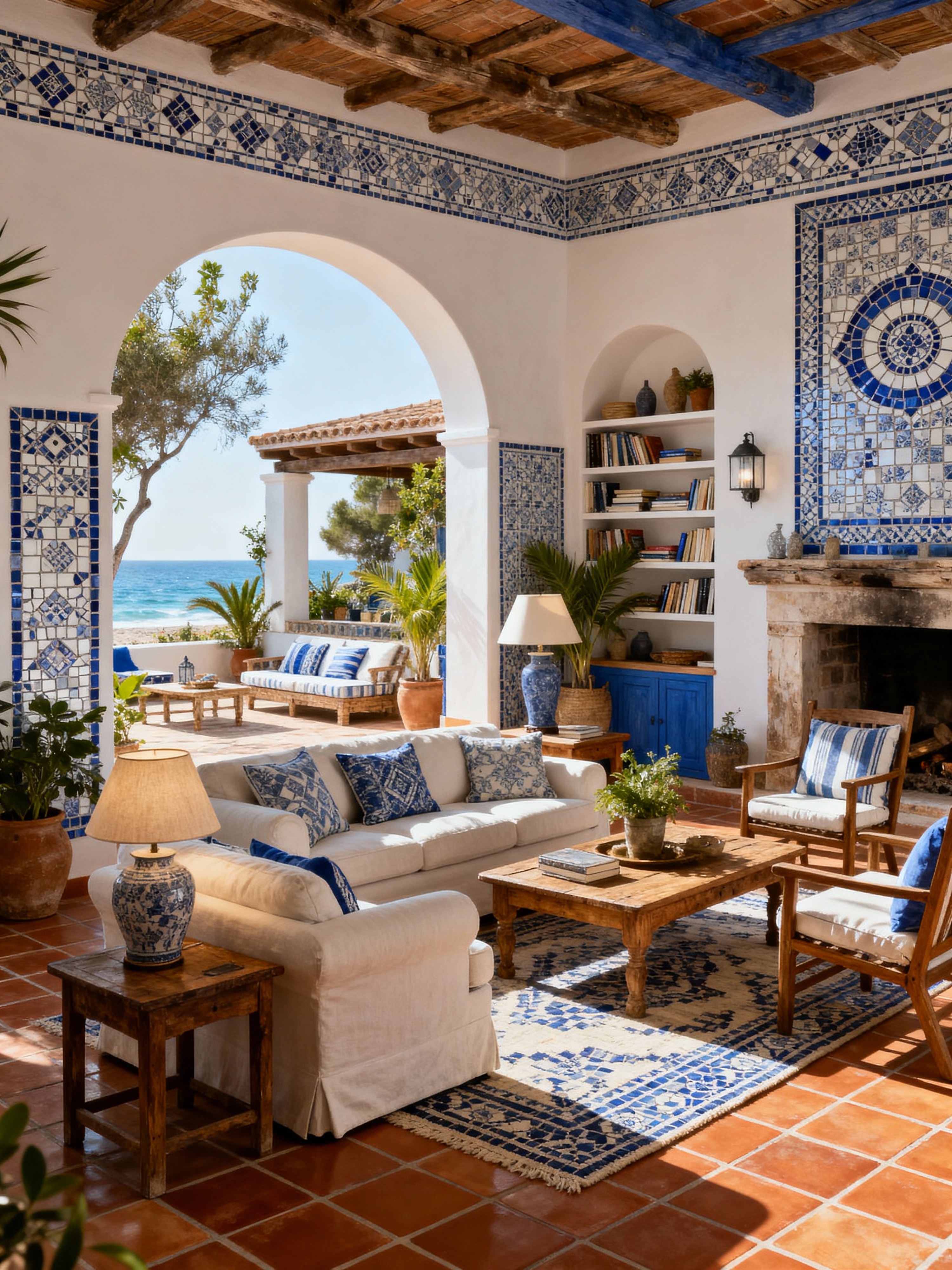 living room with mediterranean style with plant and chairs and coffee tables and bookshelves and rug and occasional tables and electric lamps and sofa. . with coastal influence and warm earth tones and arched doorways and blue and white and mosaic patterns and outdoor living and terracotta tiles and rustic charm