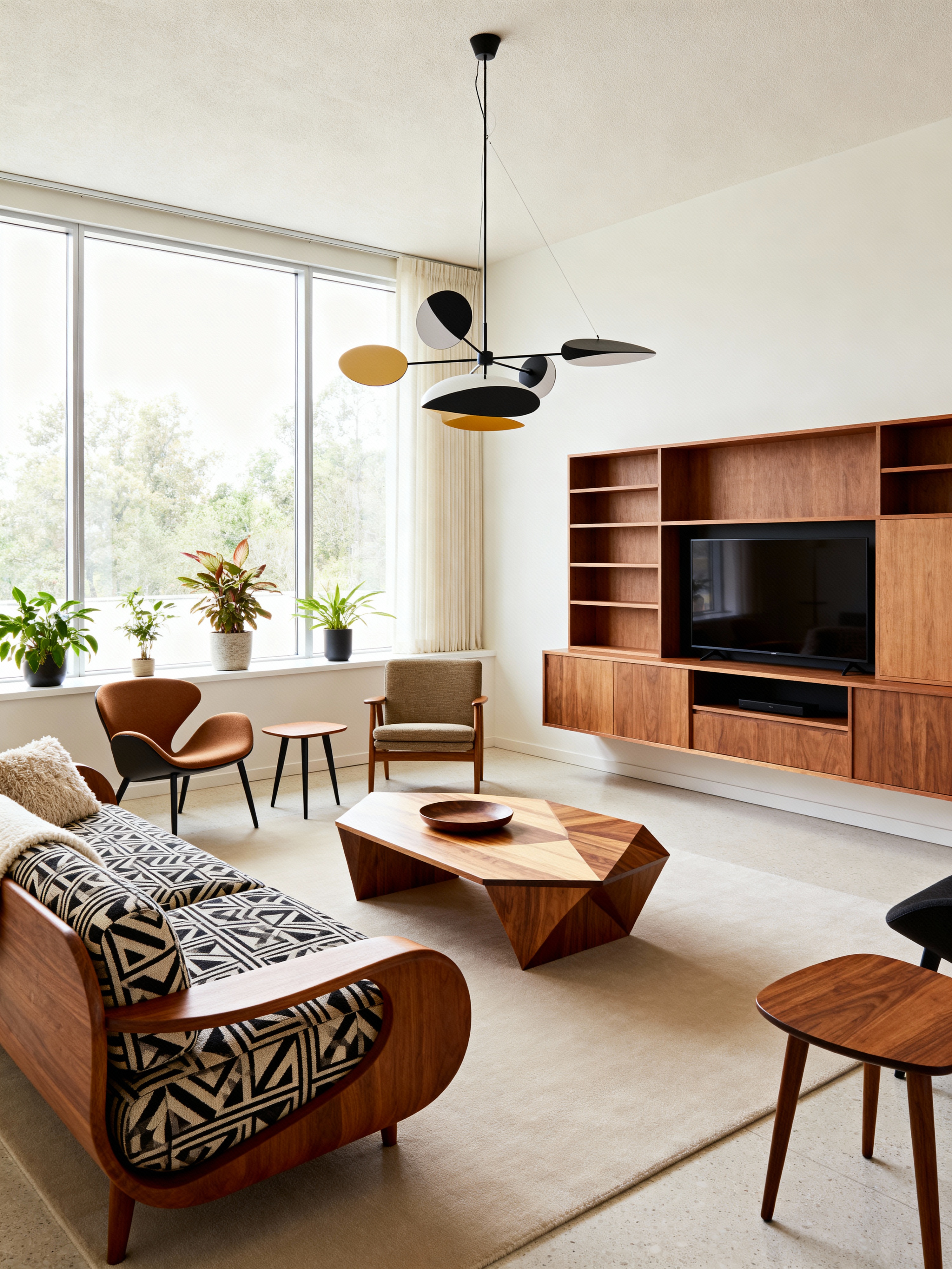 living room with midcentury modern style with televisions and furniture and chairs and coffee tables and occasional tables and bookshelves and plant and sofa. . with nature indoors and function over form and mid century modern mobile chandelier and natural and manmade materials and organic and geometric shapes and graphic shapes and clean lines and minimalist