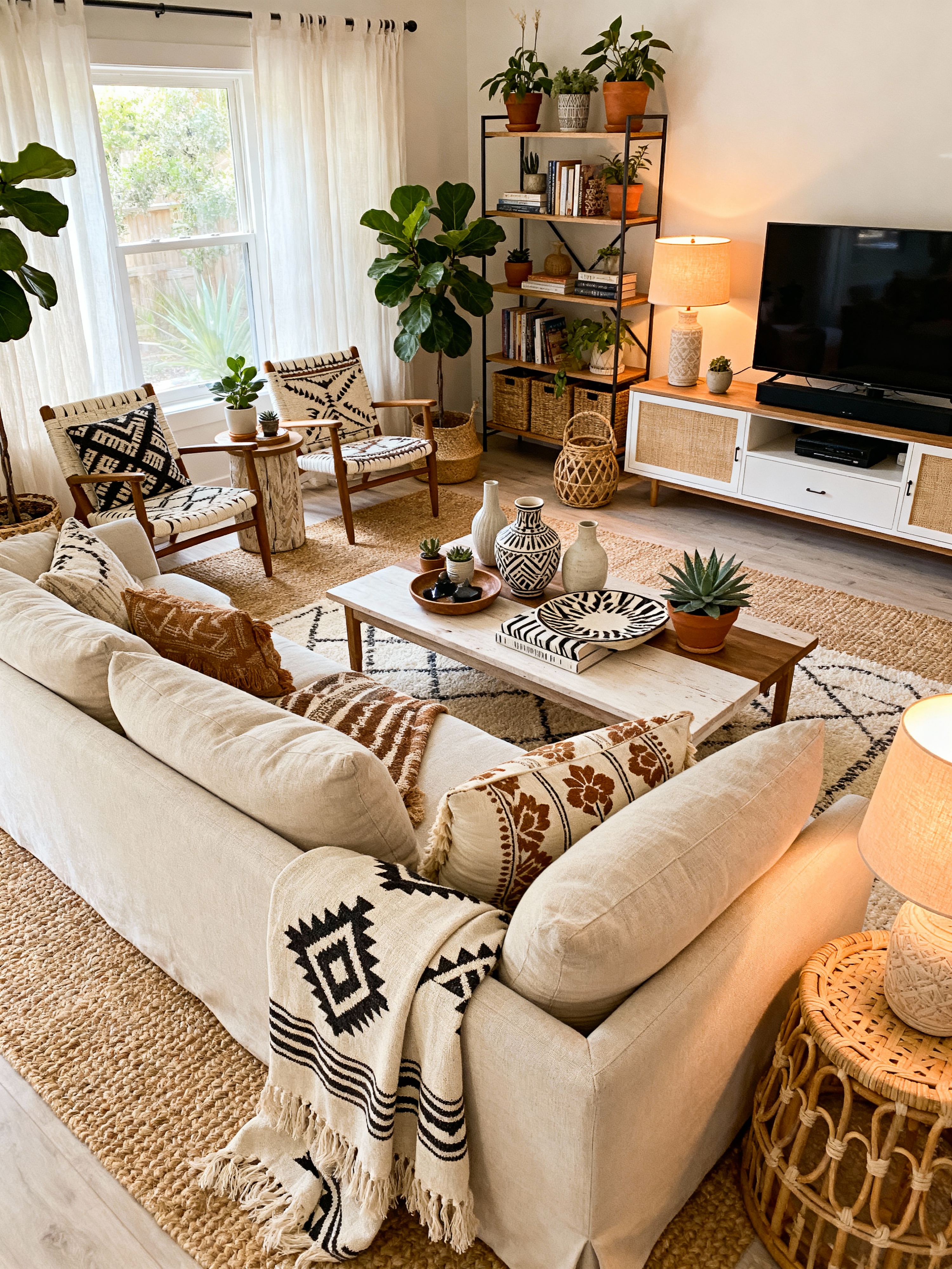 living room with modern boho style with televisions and plant and electric lamps and bookshelves and coffee tables and sofa and chairs and furniture. . with comfortable and patterns and neutral palette and expressive decor and layered textures and potted plants and artistic decor and handcrafted items
