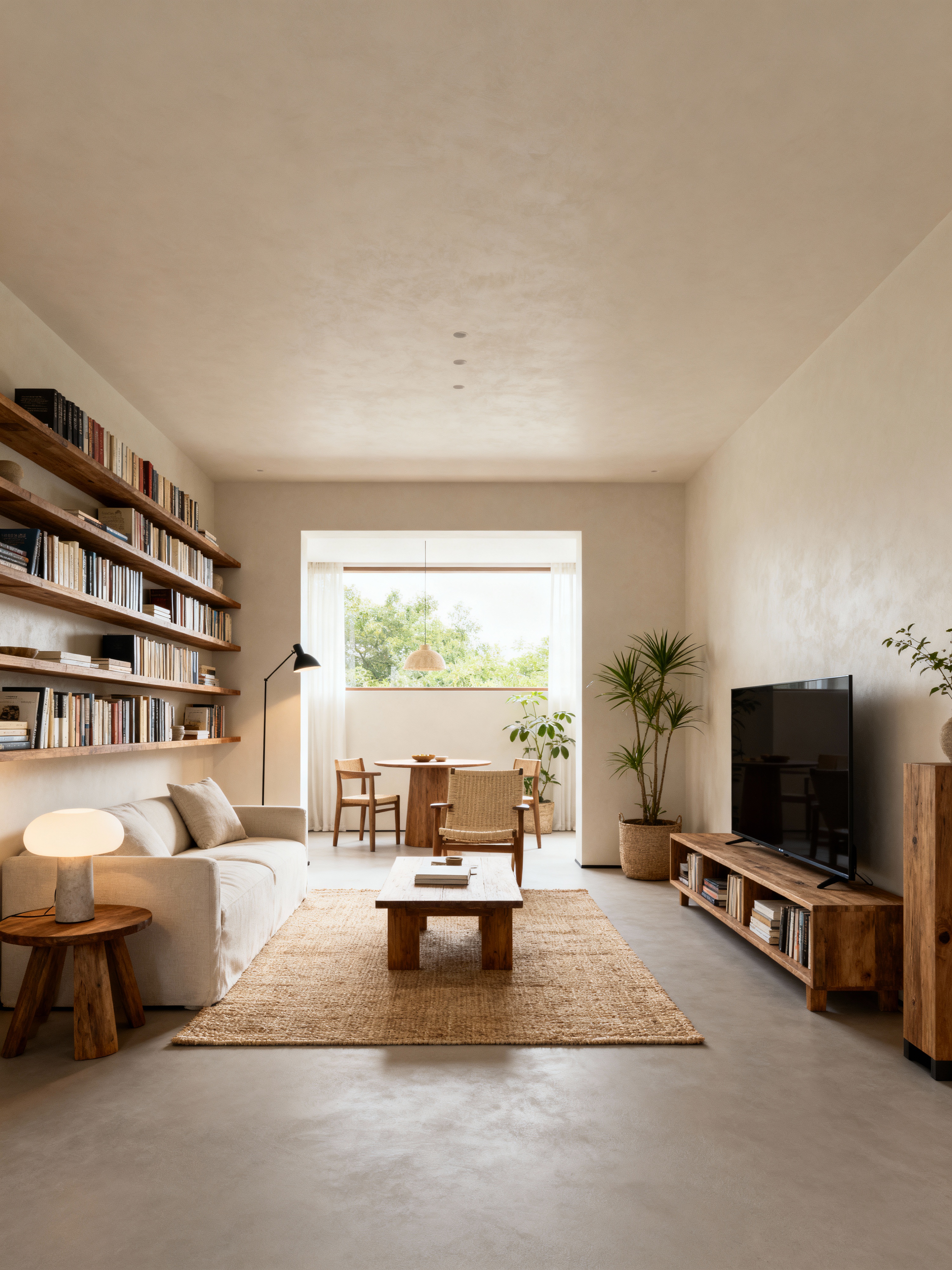 living room with modern style with rug and bookshelves and furniture and occasional tables and electric lamps and televisions and coffee tables and plant. . with open and natural lighting and simple, clean lines and simplistic furniture and natural materials and elements and practicality and functionality and neutral walls and textures and open and natural lighting