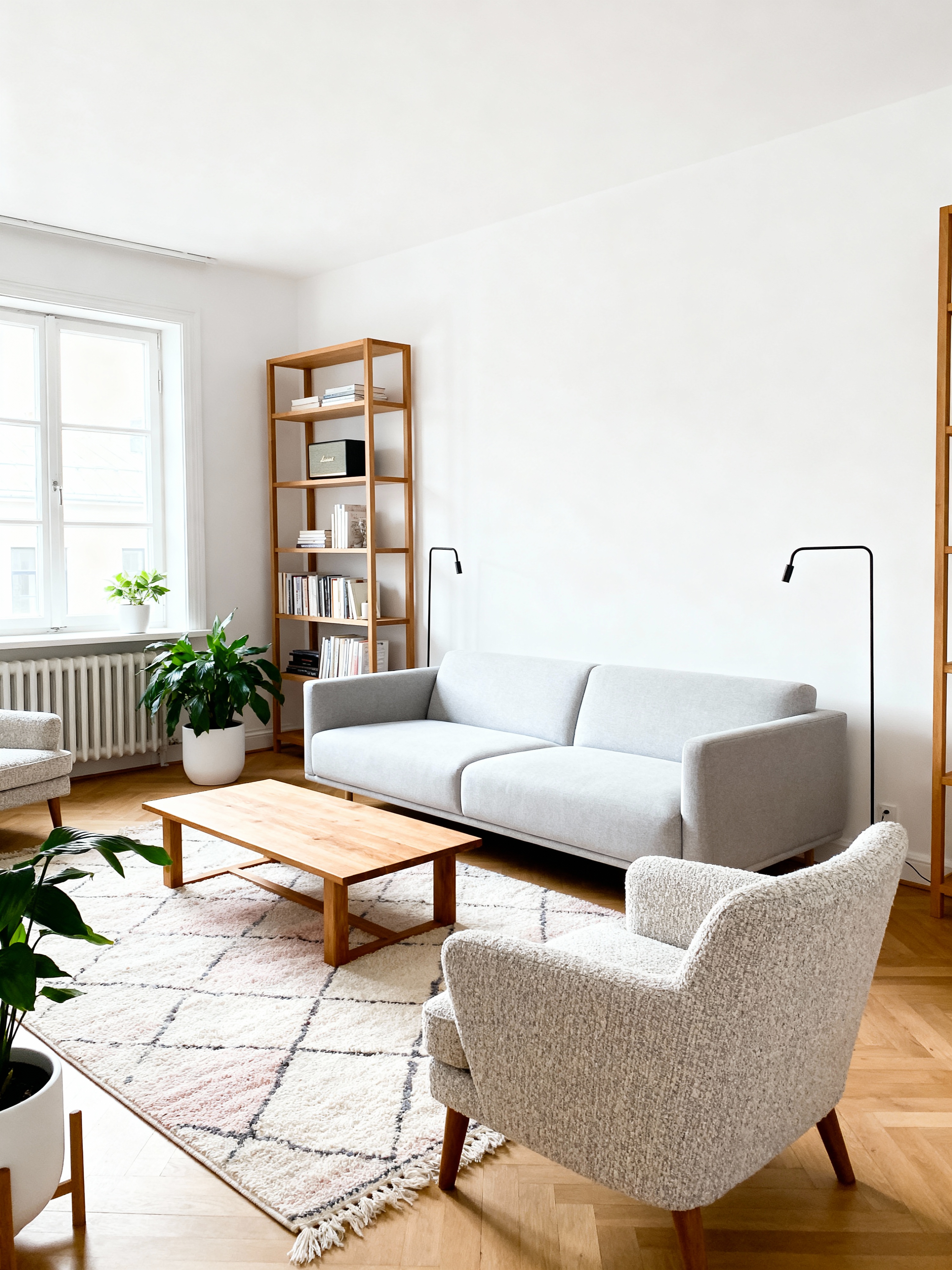 living room with scandinavian style with furniture and bookshelves and occasional tables and rug and sofa and plant and chairs and electric lamps. . with textured fabrics and functional furniture and clean lines and natural light and minimalist design and cozy atmosphere and simple elegance and white decor