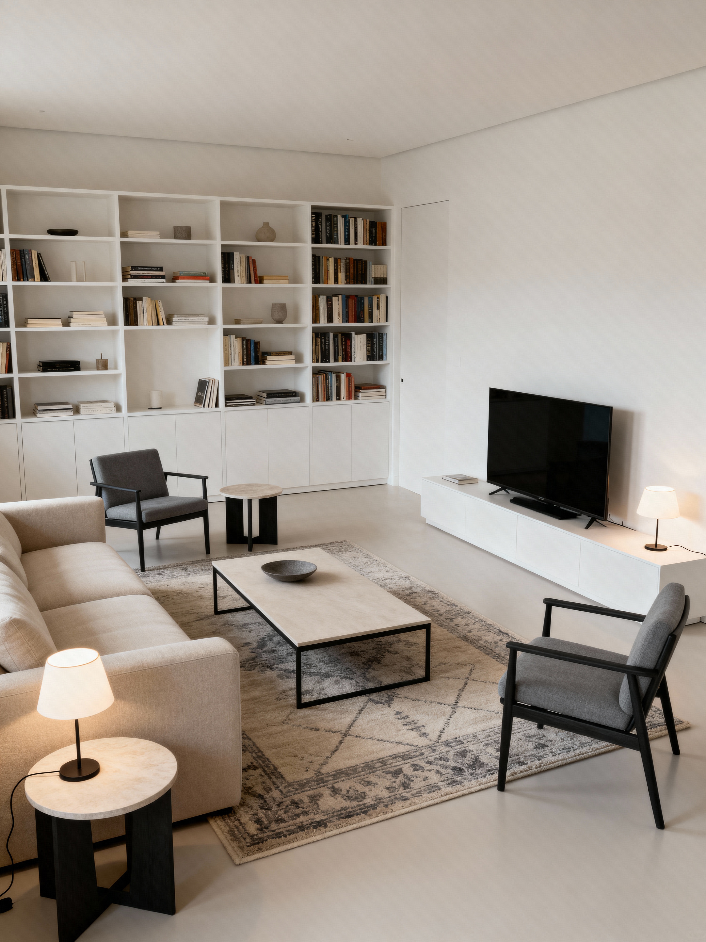 living room with simple style with electric lamps and sofa and rug and bookshelves and occasional tables and chairs and coffee tables and televisions. . with understated style and pure simplicity and uncluttered space and basic elements and functional furniture and streamlined look and neutral colors and essential pieces
