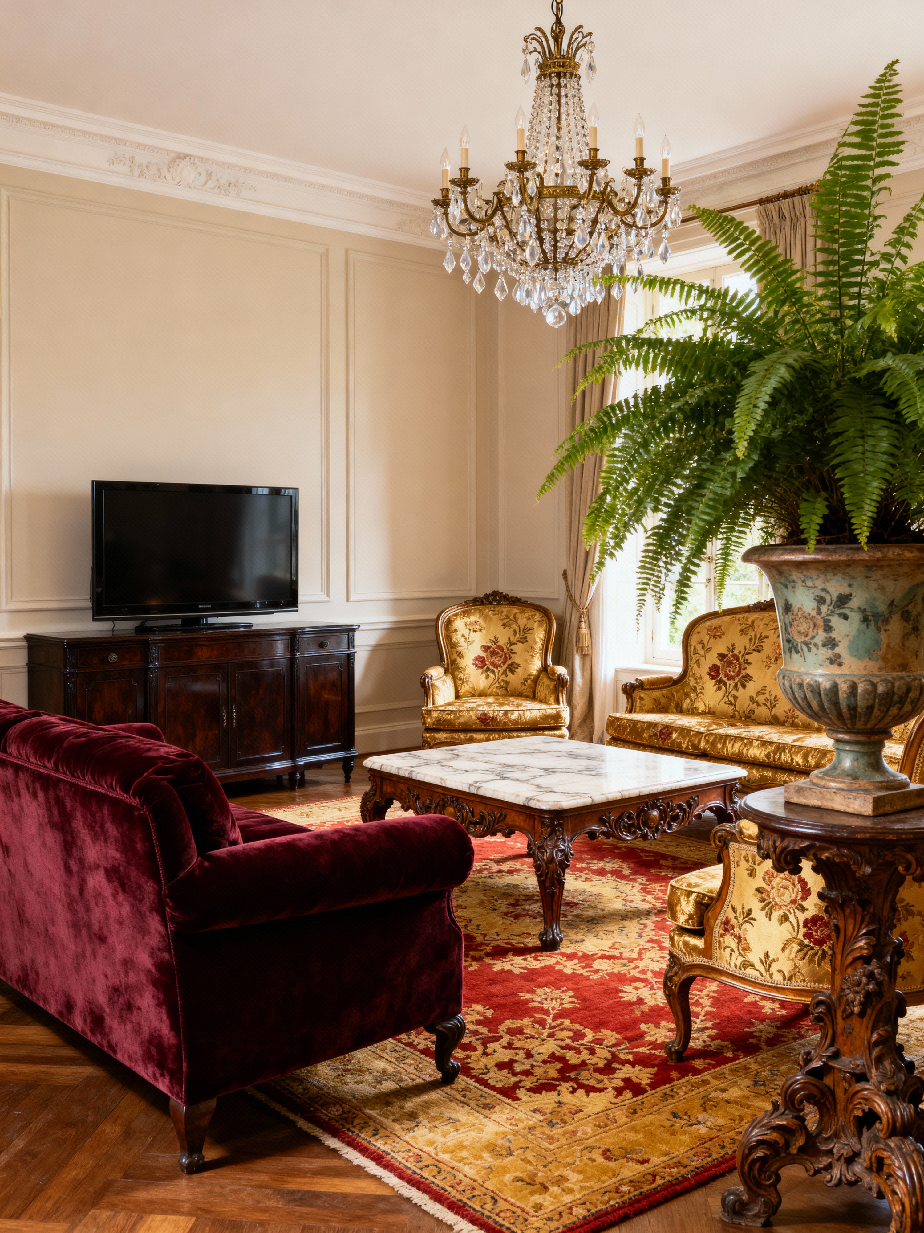 living room with traditional style with electric lamps and coffee tables and sofa and chairs and rug and televisions and plant and furniture. . with classic elegance and warm colors and rich fabrics and refined atmosphere and formal furniture and antique pieces and timeless design and ornate details