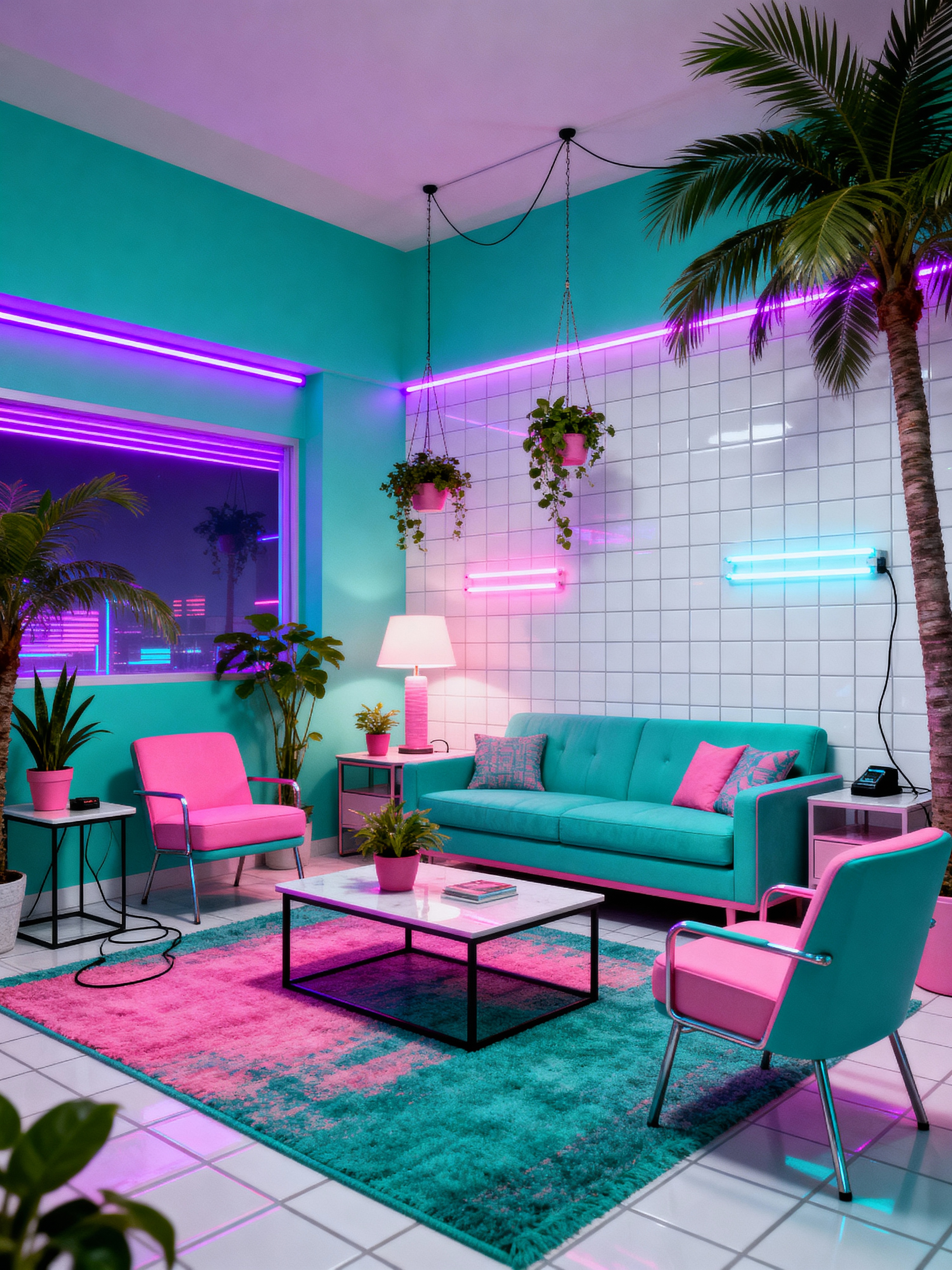 living room with vaporwave style with coffee tables and chairs and occasional tables and sofa and furniture and plant and rug and electric lamps. . with teal colors and bright pink and purple lights and white square bath tiles and palm trees and hanging plants and neon glow and washed out colors
