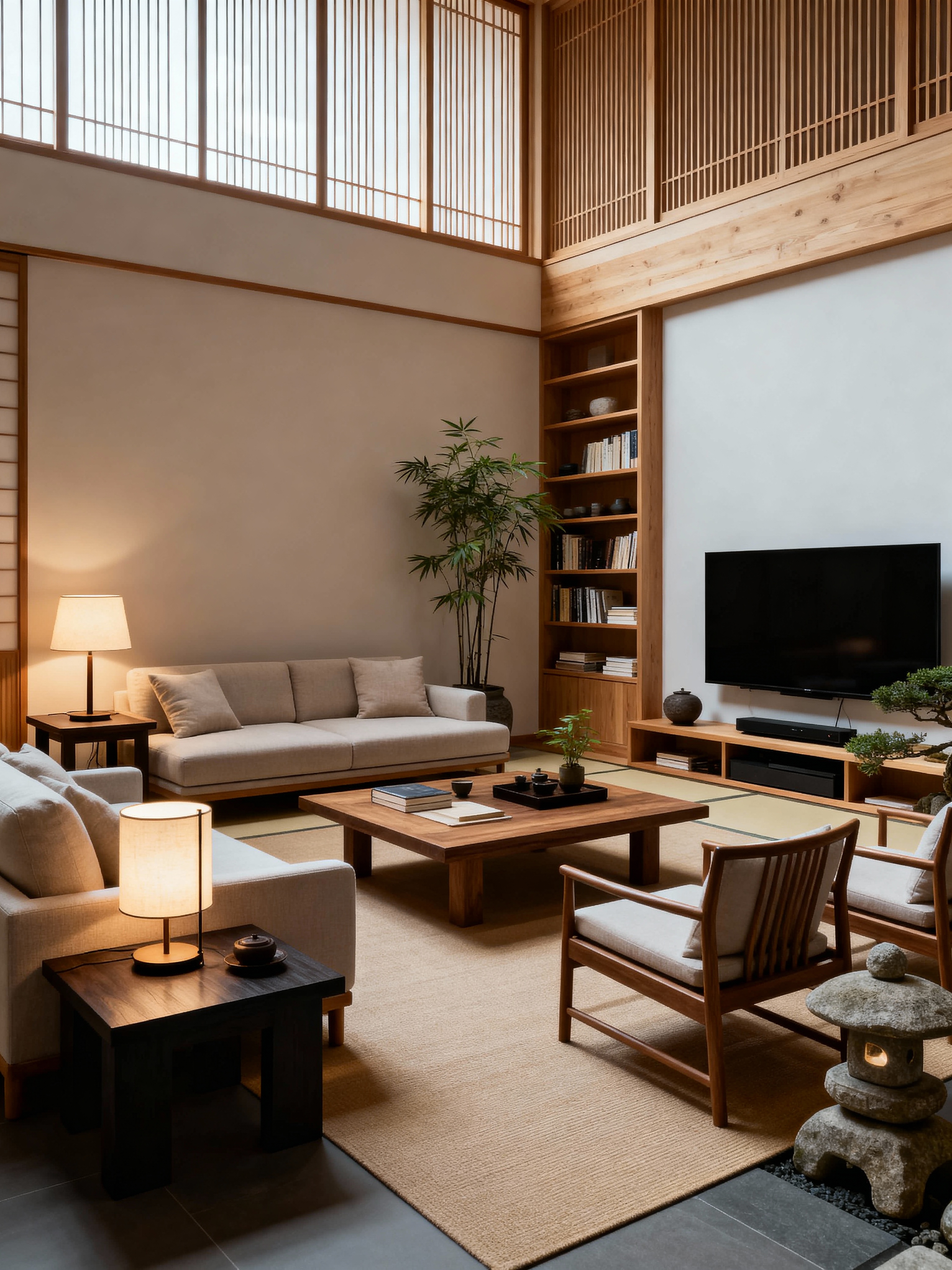 living room with zen style with occasional tables and electric lamps and plant and chairs and sofa and coffee tables and bookshelves and televisions. . with clean lines and asian interior and natural textures and simple furniture and japanese minimalist interior and clutter free and calm and neutral colors and japanese minimalist interior