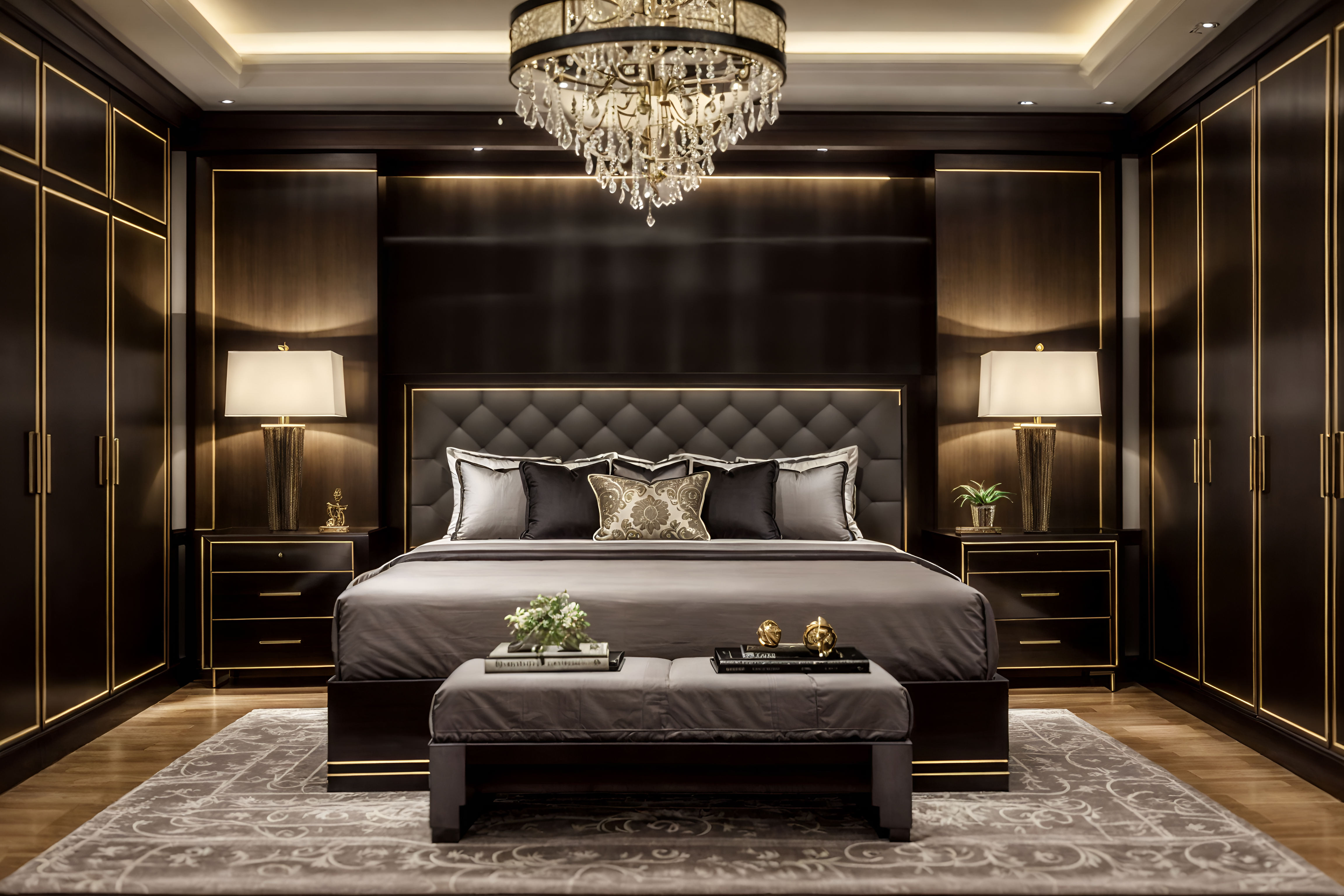 photo from pinterest of luxury-style interior designed (bedroom interior) with dresser closet and plant and headboard and bedside table or night stand and mirror and bed and storage bench or ottoman and night light cinematic photo, highly detailed, cinematic lighting, ultra-detailed, ultrarealistic, photorealism, 8k. trending on pinterest. luxury interior design style. masterpiece, cinematic light, ultrarealistic+, photorealistic+, 8k, raw photo, realistic, sharp focus on eyes, (symmetrical eyes), (intact eyes), hyperrealistic, highest quality, best quality, , highly detailed, masterpiece, best quality, extremely detailed 8k wallpaper, masterpiece, best quality, ultra-detailed, best shadow, detailed background, detailed face, detailed eyes, high contrast, best illumination, detailed face, dulux, caustic, dynamic angle, detailed glow. dramatic lighting. highly detailed, insanely detailed hair, symmetrical, intricate details, professionally retouched, 8k high definition. strong bokeh. award winning photo.