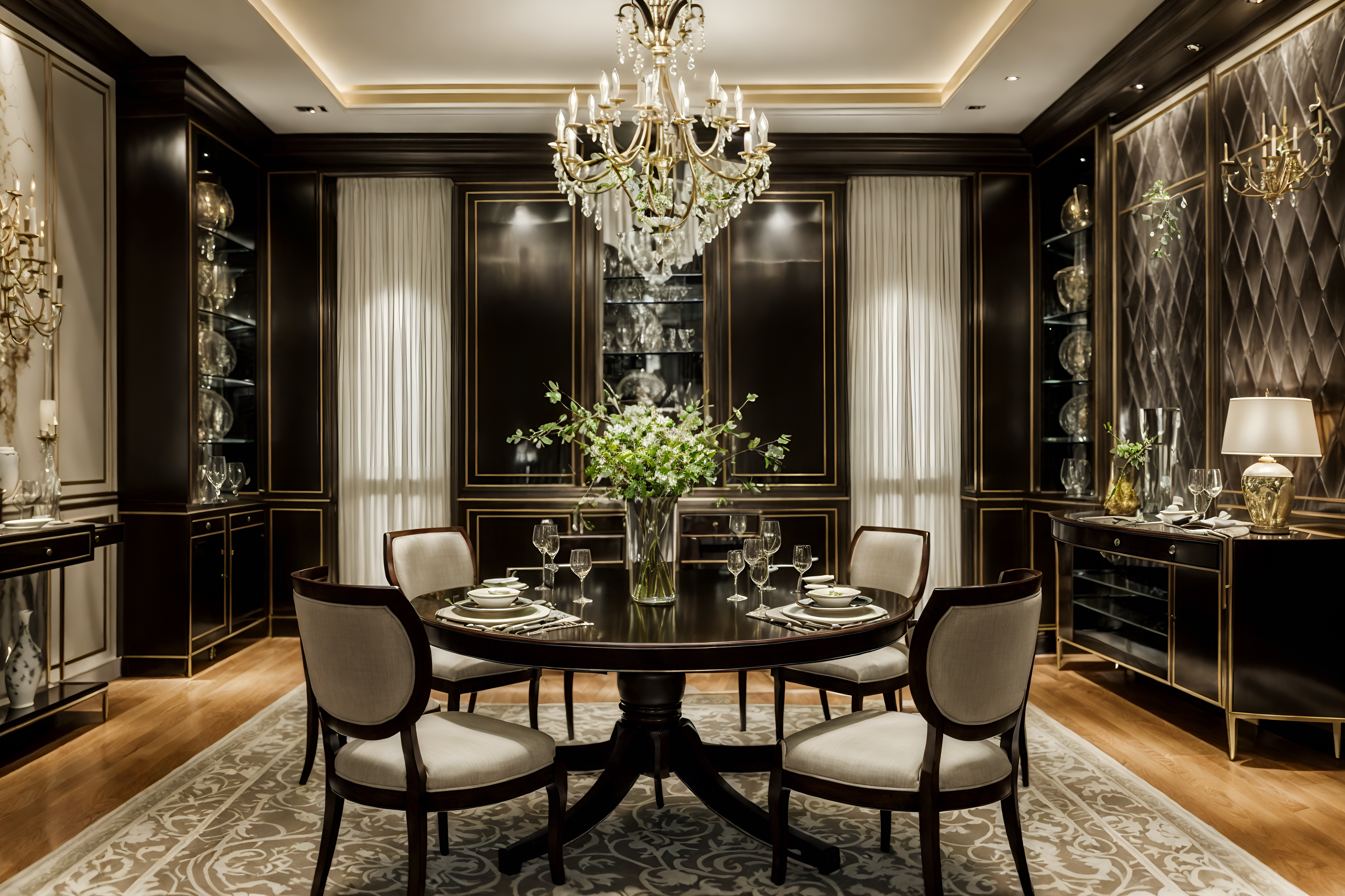 photo from pinterest of luxury-style interior designed (dining room interior) with painting or photo on wall and plates, cutlery and glasses on dining table and table cloth and light or chandelier and dining table chairs and bookshelves and vase and plant cinematic photo, highly detailed, cinematic lighting, ultra-detailed, ultrarealistic, photorealism, 8k. trending on pinterest. luxury interior design style. masterpiece, cinematic light, ultrarealistic+, photorealistic+, 8k, raw photo, realistic, sharp focus on eyes, (symmetrical eyes), (intact eyes), hyperrealistic, highest quality, best quality, , highly detailed, masterpiece, best quality, extremely detailed 8k wallpaper, masterpiece, best quality, ultra-detailed, best shadow, detailed background, detailed face, detailed eyes, high contrast, best illumination, detailed face, dulux, caustic, dynamic angle, detailed glow. dramatic lighting. highly detailed, insanely detailed hair, symmetrical, intricate details, professionally retouched, 8k high definition. strong bokeh. award winning photo.