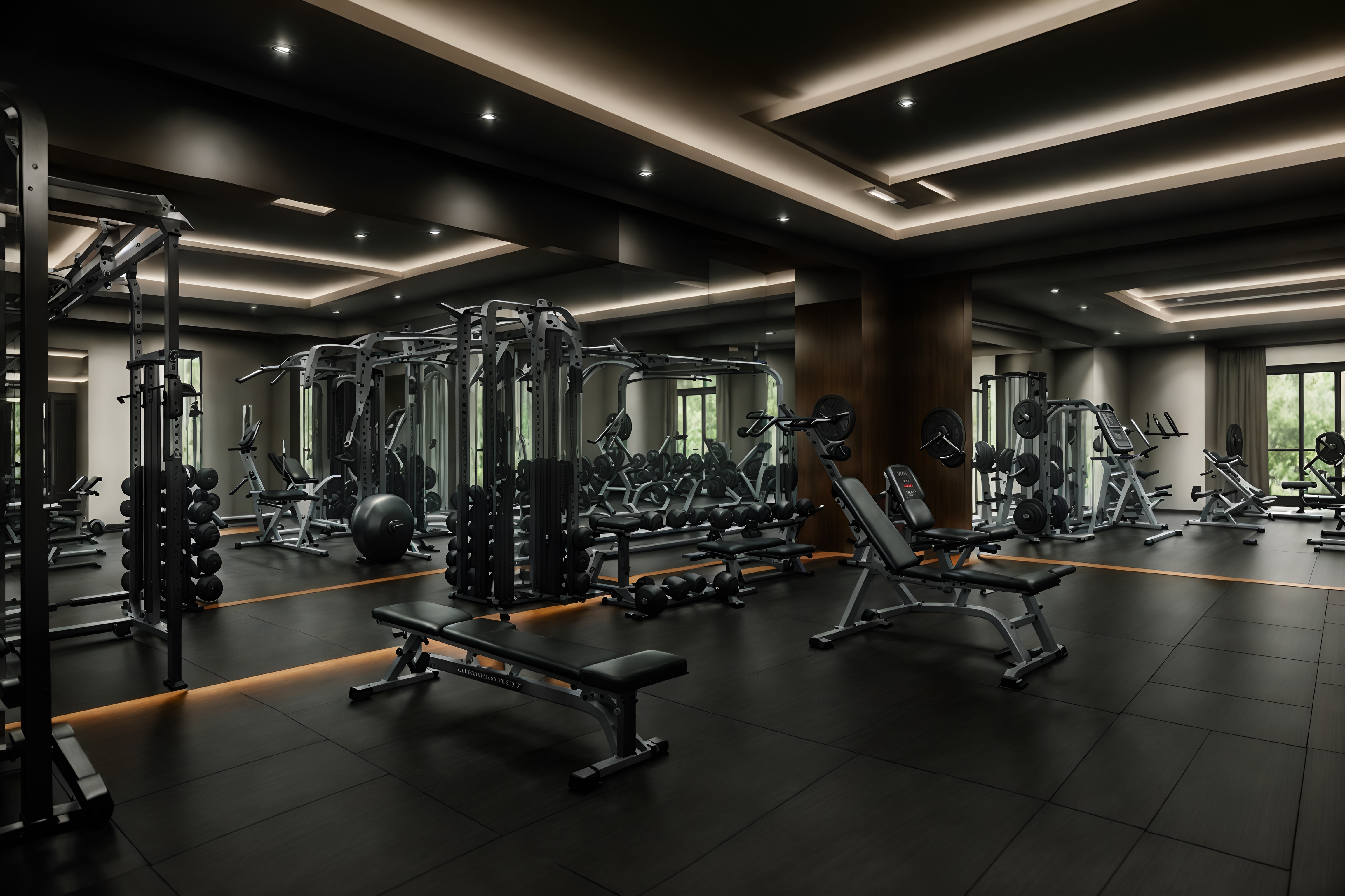 photo from pinterest of luxury-style interior designed (fitness gym interior) with bench press and crosstrainer and exercise bicycle and squat rack and dumbbell stand and bench press cinematic photo, highly detailed, cinematic lighting, ultra-detailed, ultrarealistic, photorealism, 8k. trending on pinterest. luxury interior design style. masterpiece, cinematic light, ultrarealistic+, photorealistic+, 8k, raw photo, realistic, sharp focus on eyes, (symmetrical eyes), (intact eyes), hyperrealistic, highest quality, best quality, , highly detailed, masterpiece, best quality, extremely detailed 8k wallpaper, masterpiece, best quality, ultra-detailed, best shadow, detailed background, detailed face, detailed eyes, high contrast, best illumination, detailed face, dulux, caustic, dynamic angle, detailed glow. dramatic lighting. highly detailed, insanely detailed hair, symmetrical, intricate details, professionally retouched, 8k high definition. strong bokeh. award winning photo.