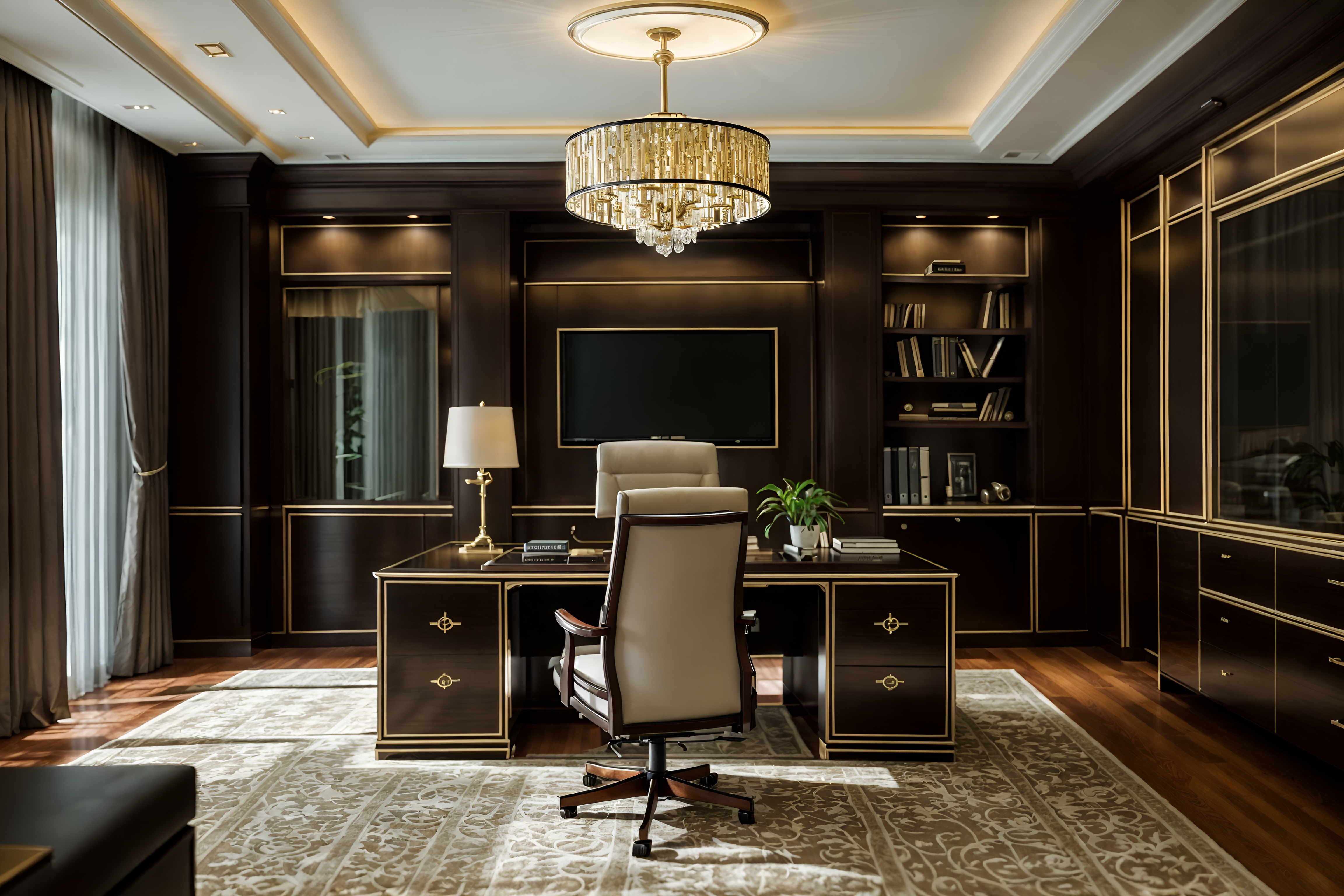 photo from pinterest of luxury-style interior designed (home office interior) with desk lamp and computer desk and office chair and cabinets and plant and desk lamp cinematic photo, highly detailed, cinematic lighting, ultra-detailed, ultrarealistic, photorealism, 8k. trending on pinterest. luxury interior design style. masterpiece, cinematic light, ultrarealistic+, photorealistic+, 8k, raw photo, realistic, sharp focus on eyes, (symmetrical eyes), (intact eyes), hyperrealistic, highest quality, best quality, , highly detailed, masterpiece, best quality, extremely detailed 8k wallpaper, masterpiece, best quality, ultra-detailed, best shadow, detailed background, detailed face, detailed eyes, high contrast, best illumination, detailed face, dulux, caustic, dynamic angle, detailed glow. dramatic lighting. highly detailed, insanely detailed hair, symmetrical, intricate details, professionally retouched, 8k high definition. strong bokeh. award winning photo.