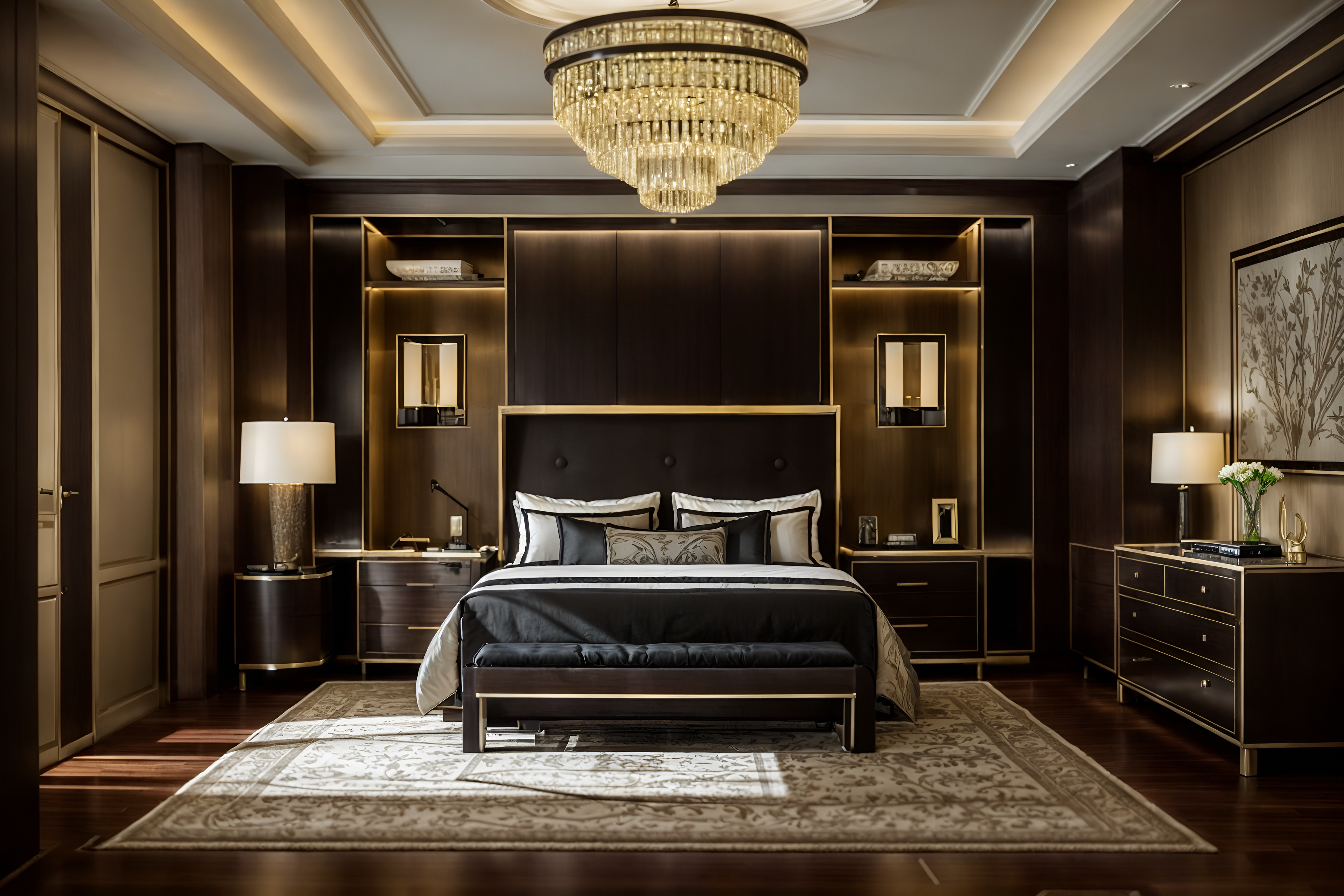 photo from pinterest of luxury-style interior designed (hotel room interior) with working desk with desk chair and dresser closet and storage bench or ottoman and bedside table or night stand and accent chair and night light and plant and bed cinematic photo, highly detailed, cinematic lighting, ultra-detailed, ultrarealistic, photorealism, 8k. trending on pinterest. luxury interior design style. masterpiece, cinematic light, ultrarealistic+, photorealistic+, 8k, raw photo, realistic, sharp focus on eyes, (symmetrical eyes), (intact eyes), hyperrealistic, highest quality, best quality, , highly detailed, masterpiece, best quality, extremely detailed 8k wallpaper, masterpiece, best quality, ultra-detailed, best shadow, detailed background, detailed face, detailed eyes, high contrast, best illumination, detailed face, dulux, caustic, dynamic angle, detailed glow. dramatic lighting. highly detailed, insanely detailed hair, symmetrical, intricate details, professionally retouched, 8k high definition. strong bokeh. award winning photo.