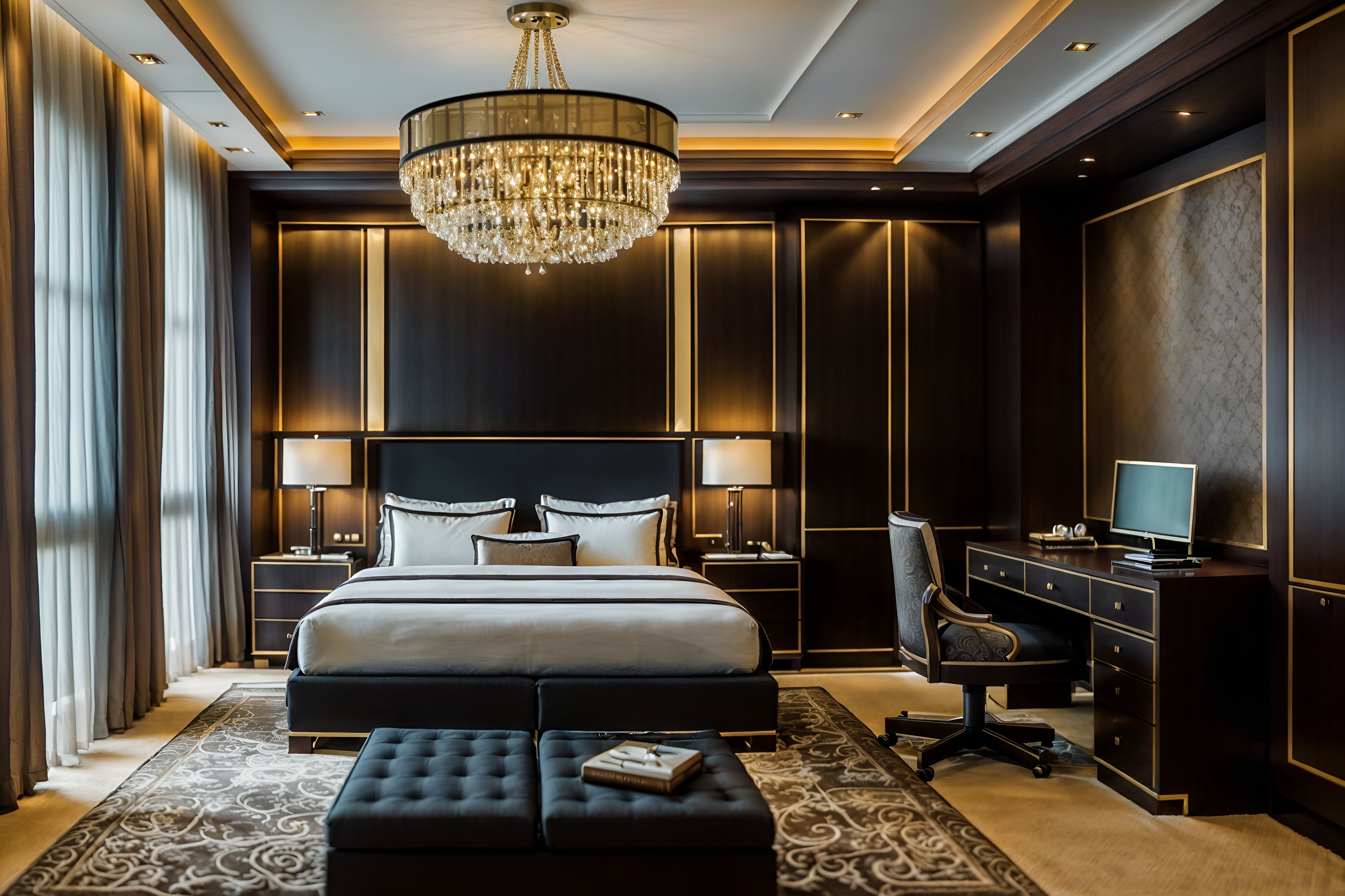 photo from pinterest of luxury-style interior designed (hotel room interior) with working desk with desk chair and dresser closet and storage bench or ottoman and bedside table or night stand and accent chair and night light and plant and bed cinematic photo, highly detailed, cinematic lighting, ultra-detailed, ultrarealistic, photorealism, 8k. trending on pinterest. luxury interior design style. masterpiece, cinematic light, ultrarealistic+, photorealistic+, 8k, raw photo, realistic, sharp focus on eyes, (symmetrical eyes), (intact eyes), hyperrealistic, highest quality, best quality, , highly detailed, masterpiece, best quality, extremely detailed 8k wallpaper, masterpiece, best quality, ultra-detailed, best shadow, detailed background, detailed face, detailed eyes, high contrast, best illumination, detailed face, dulux, caustic, dynamic angle, detailed glow. dramatic lighting. highly detailed, insanely detailed hair, symmetrical, intricate details, professionally retouched, 8k high definition. strong bokeh. award winning photo.
