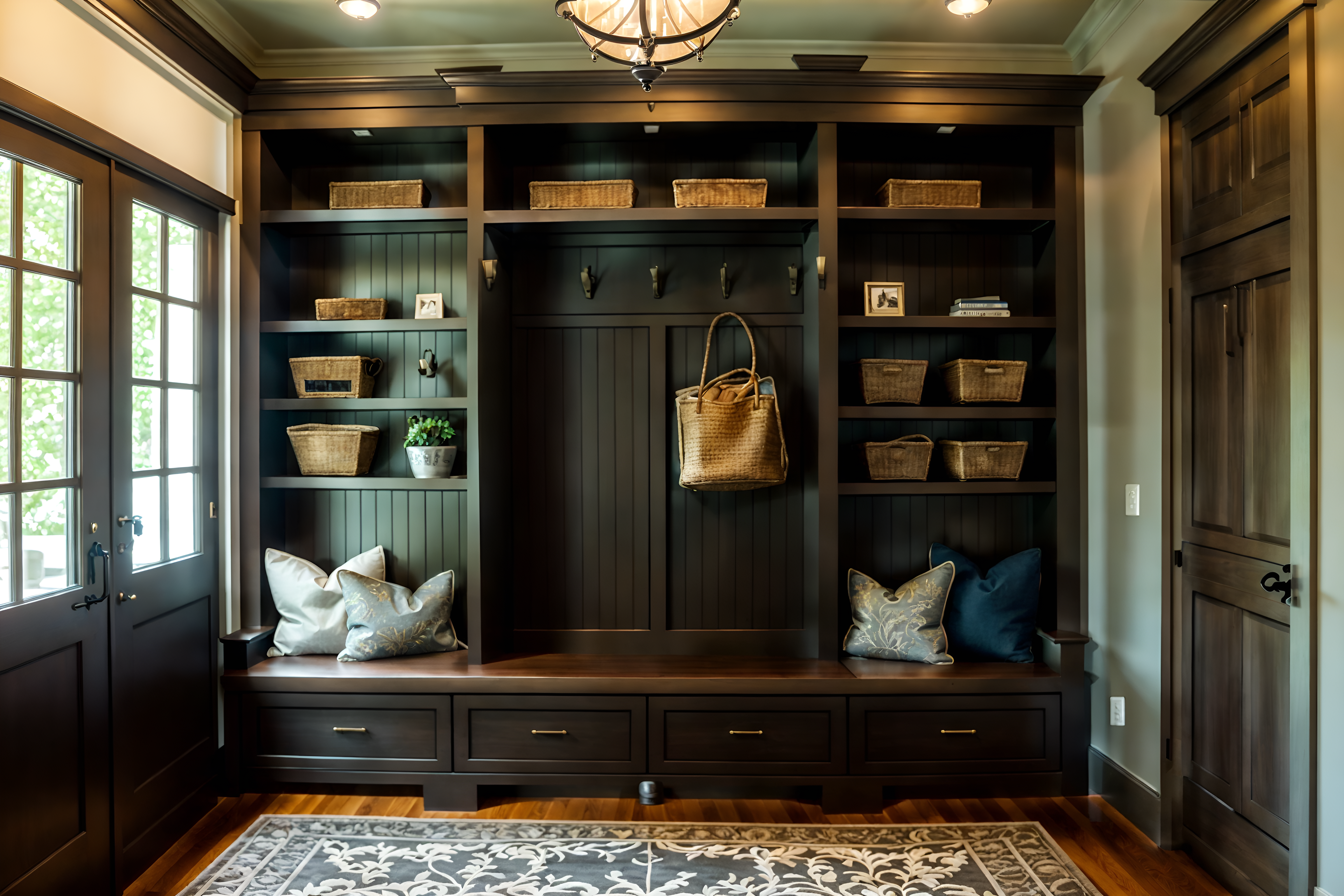 photo from pinterest of luxury-style interior designed (mudroom interior) with high up storage and a bench and shelves for shoes and storage baskets and cubbies and cabinets and storage drawers and wall hooks for coats cinematic photo, highly detailed, cinematic lighting, ultra-detailed, ultrarealistic, photorealism, 8k. trending on pinterest. luxury interior design style. masterpiece, cinematic light, ultrarealistic+, photorealistic+, 8k, raw photo, realistic, sharp focus on eyes, (symmetrical eyes), (intact eyes), hyperrealistic, highest quality, best quality, , highly detailed, masterpiece, best quality, extremely detailed 8k wallpaper, masterpiece, best quality, ultra-detailed, best shadow, detailed background, detailed face, detailed eyes, high contrast, best illumination, detailed face, dulux, caustic, dynamic angle, detailed glow. dramatic lighting. highly detailed, insanely detailed hair, symmetrical, intricate details, professionally retouched, 8k high definition. strong bokeh. award winning photo.