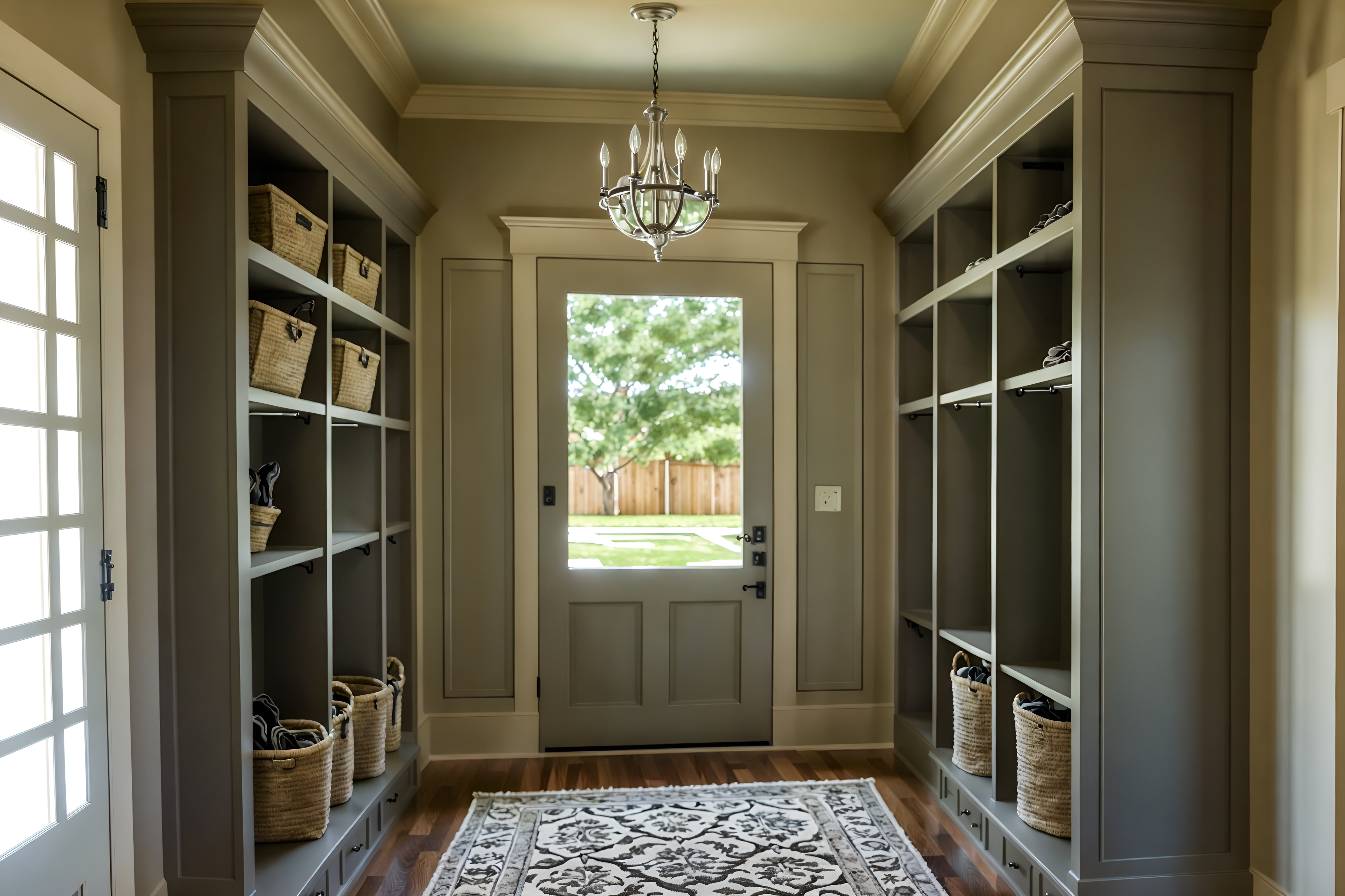photo from pinterest of luxury-style interior designed (mudroom interior) with high up storage and a bench and shelves for shoes and storage baskets and cubbies and cabinets and storage drawers and wall hooks for coats cinematic photo, highly detailed, cinematic lighting, ultra-detailed, ultrarealistic, photorealism, 8k. trending on pinterest. luxury interior design style. masterpiece, cinematic light, ultrarealistic+, photorealistic+, 8k, raw photo, realistic, sharp focus on eyes, (symmetrical eyes), (intact eyes), hyperrealistic, highest quality, best quality, , highly detailed, masterpiece, best quality, extremely detailed 8k wallpaper, masterpiece, best quality, ultra-detailed, best shadow, detailed background, detailed face, detailed eyes, high contrast, best illumination, detailed face, dulux, caustic, dynamic angle, detailed glow. dramatic lighting. highly detailed, insanely detailed hair, symmetrical, intricate details, professionally retouched, 8k high definition. strong bokeh. award winning photo.