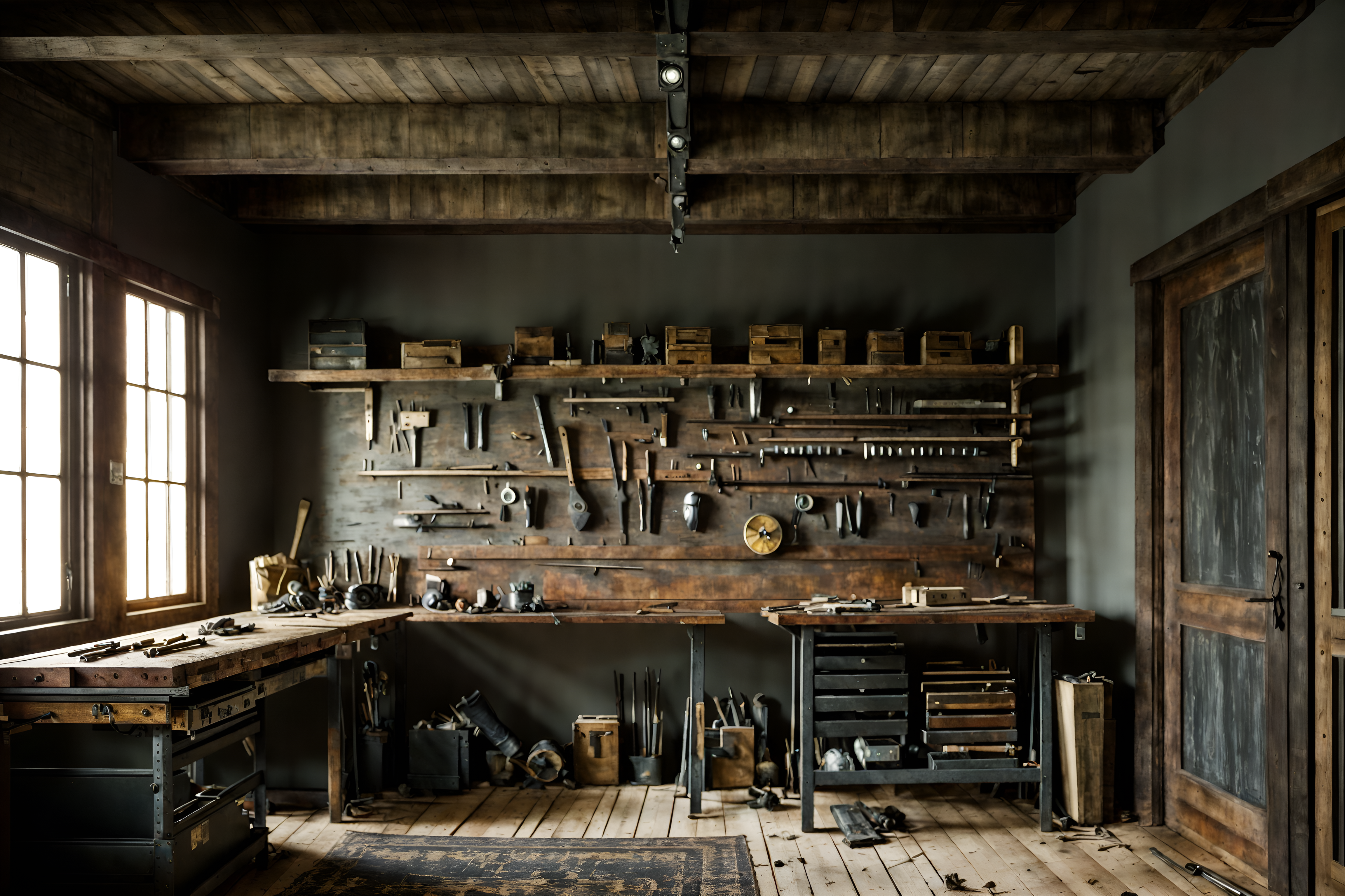 photo from pinterest of luxury-style interior designed (workshop interior) with tool wall and messy and wooden workbench and tool wall cinematic photo, highly detailed, cinematic lighting, ultra-detailed, ultrarealistic, photorealism, 8k. trending on pinterest. luxury interior design style. masterpiece, cinematic light, ultrarealistic+, photorealistic+, 8k, raw photo, realistic, sharp focus on eyes, (symmetrical eyes), (intact eyes), hyperrealistic, highest quality, best quality, , highly detailed, masterpiece, best quality, extremely detailed 8k wallpaper, masterpiece, best quality, ultra-detailed, best shadow, detailed background, detailed face, detailed eyes, high contrast, best illumination, detailed face, dulux, caustic, dynamic angle, detailed glow. dramatic lighting. highly detailed, insanely detailed hair, symmetrical, intricate details, professionally retouched, 8k high definition. strong bokeh. award winning photo.