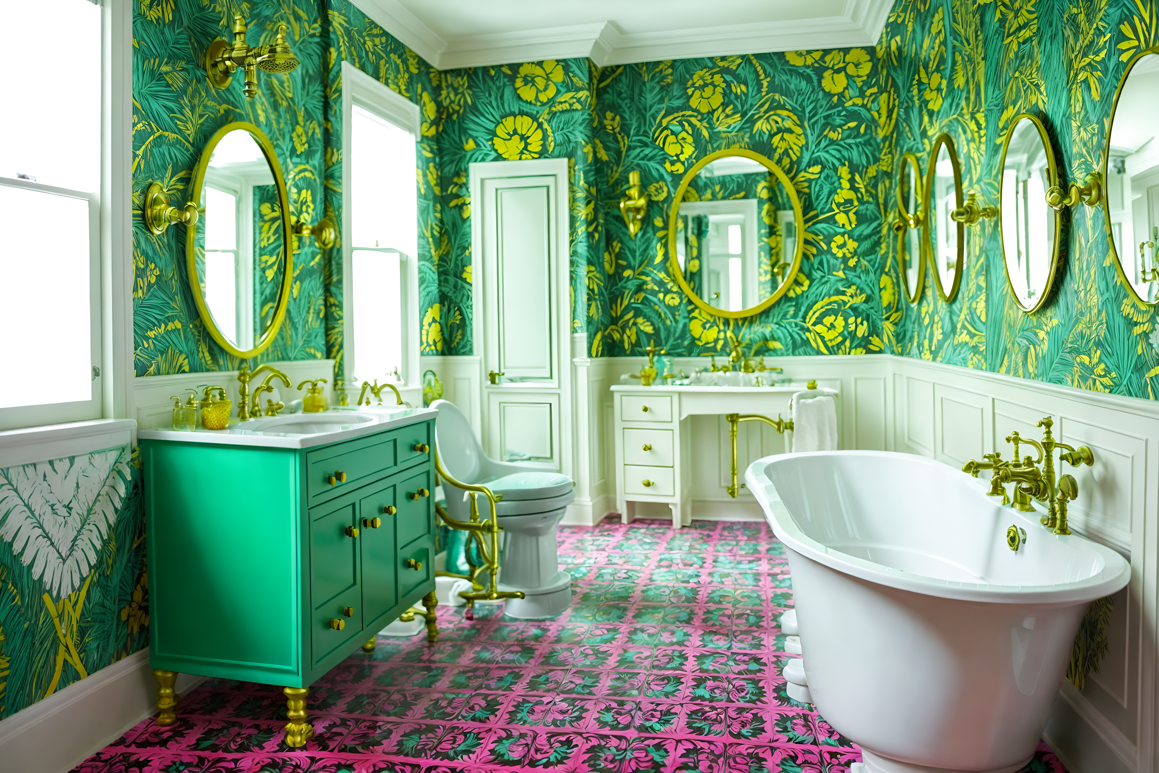 photo from pinterest of maximalist-style interior designed (bathroom interior) with bathtub and bathroom sink with faucet and bathroom cabinet and toilet seat and bath rail and shower and mirror and plant. . with vibrant and bold creativity and bold patterns and more is more philosophy and bold colors and over-the-top aesthetic and eye-catching and bold design. . cinematic photo, highly detailed, cinematic lighting, ultra-detailed, ultrarealistic, photorealism, 8k. trending on pinterest. maximalist interior design style. masterpiece, cinematic light, ultrarealistic+, photorealistic+, 8k, raw photo, realistic, sharp focus on eyes, (symmetrical eyes), (intact eyes), hyperrealistic, highest quality, best quality, , highly detailed, masterpiece, best quality, extremely detailed 8k wallpaper, masterpiece, best quality, ultra-detailed, best shadow, detailed background, detailed face, detailed eyes, high contrast, best illumination, detailed face, dulux, caustic, dynamic angle, detailed glow. dramatic lighting. highly detailed, insanely detailed hair, symmetrical, intricate details, professionally retouched, 8k high definition. strong bokeh. award winning photo.