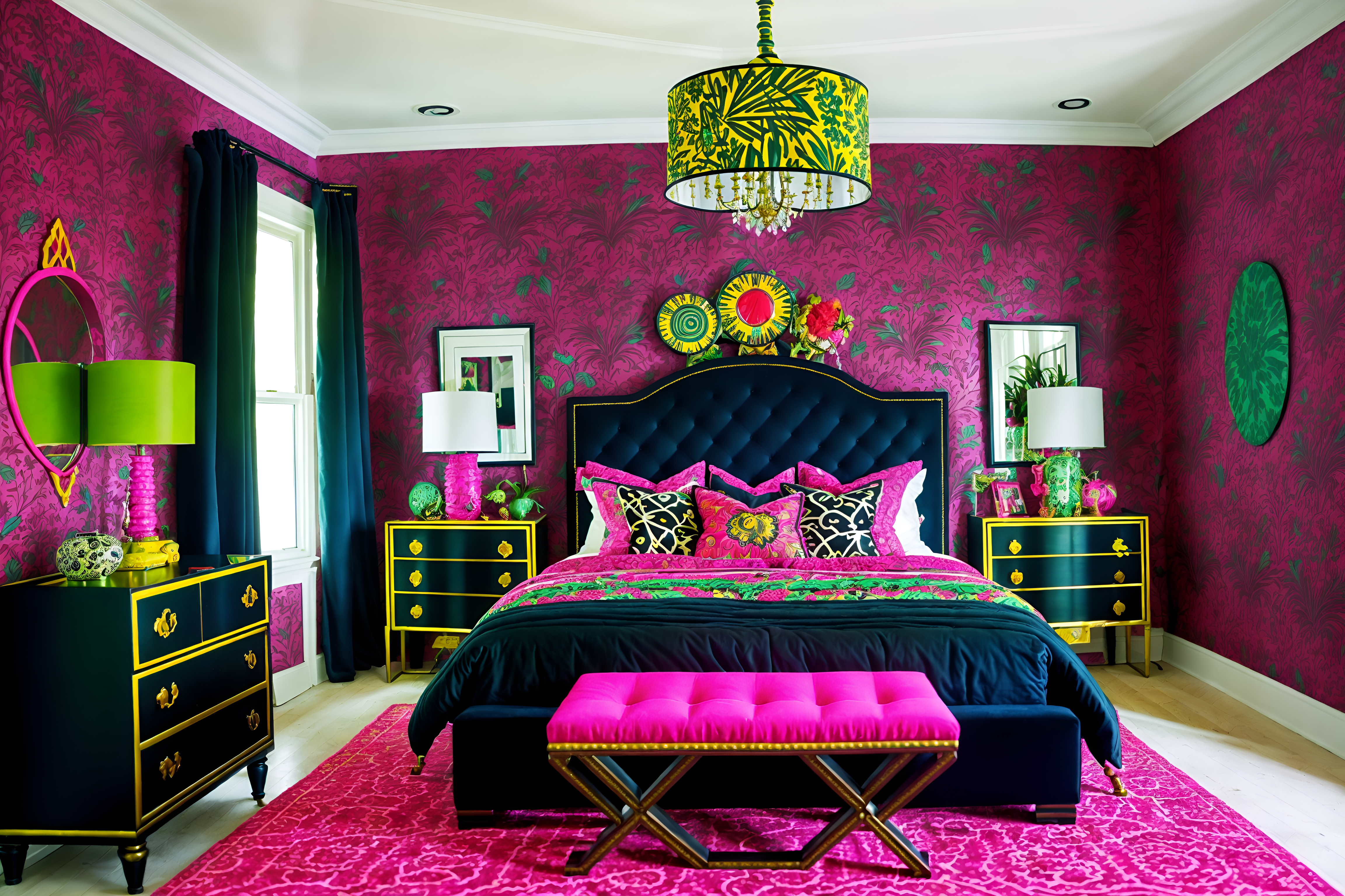 photo from pinterest of maximalist-style interior designed (bedroom interior) with plant and accent chair and storage bench or ottoman and night light and bedside table or night stand and bed and dresser closet and headboard. . with bold colors and eye-catching and vibrant and playful and bold design and more is more philosophy and over-the-top aesthetic and bold creativity. . cinematic photo, highly detailed, cinematic lighting, ultra-detailed, ultrarealistic, photorealism, 8k. trending on pinterest. maximalist interior design style. masterpiece, cinematic light, ultrarealistic+, photorealistic+, 8k, raw photo, realistic, sharp focus on eyes, (symmetrical eyes), (intact eyes), hyperrealistic, highest quality, best quality, , highly detailed, masterpiece, best quality, extremely detailed 8k wallpaper, masterpiece, best quality, ultra-detailed, best shadow, detailed background, detailed face, detailed eyes, high contrast, best illumination, detailed face, dulux, caustic, dynamic angle, detailed glow. dramatic lighting. highly detailed, insanely detailed hair, symmetrical, intricate details, professionally retouched, 8k high definition. strong bokeh. award winning photo.