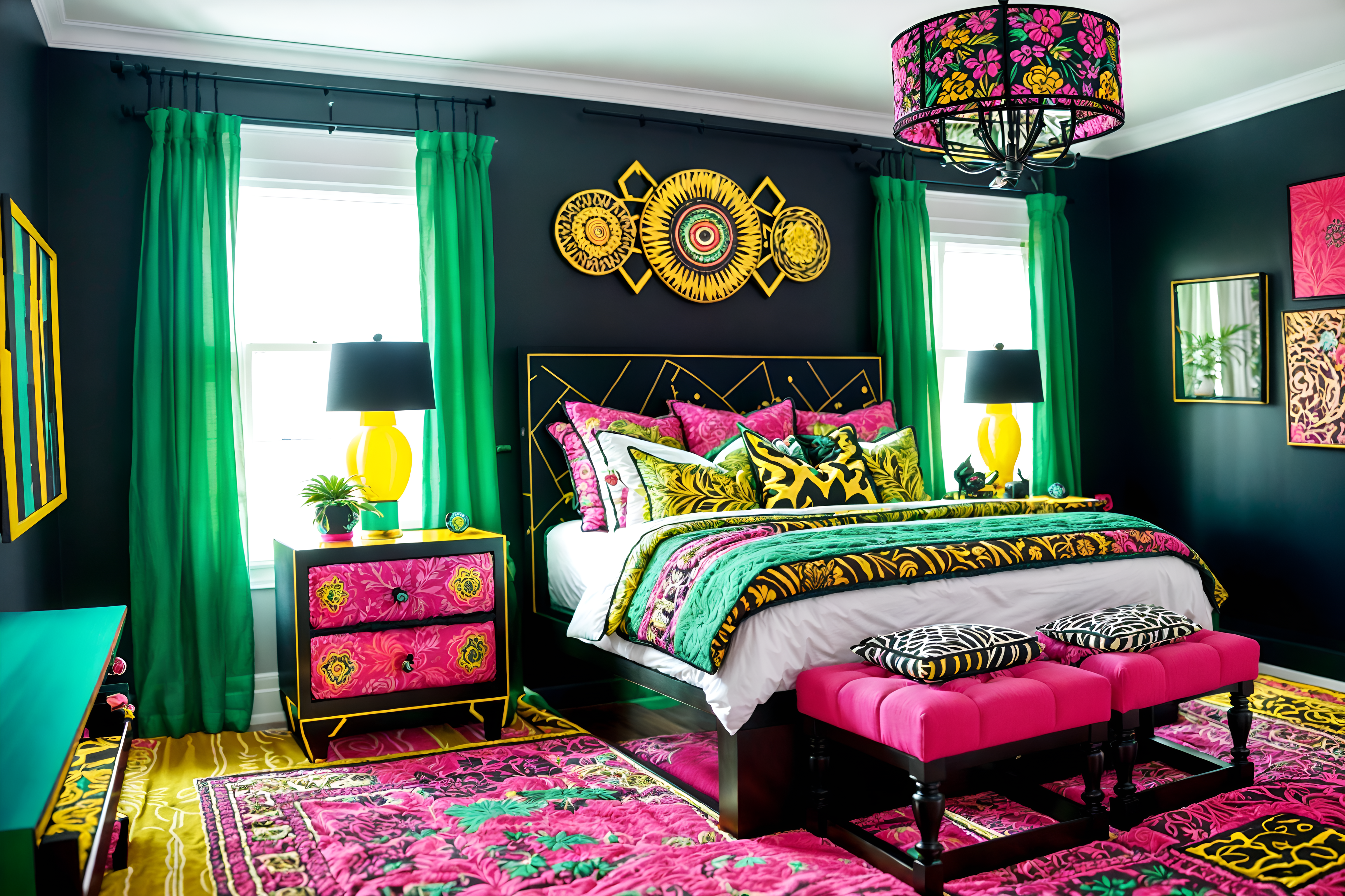 photo from pinterest of maximalist-style interior designed (bedroom interior) with plant and accent chair and storage bench or ottoman and night light and bedside table or night stand and bed and dresser closet and headboard. . with bold colors and eye-catching and vibrant and playful and bold design and more is more philosophy and over-the-top aesthetic and bold creativity. . cinematic photo, highly detailed, cinematic lighting, ultra-detailed, ultrarealistic, photorealism, 8k. trending on pinterest. maximalist interior design style. masterpiece, cinematic light, ultrarealistic+, photorealistic+, 8k, raw photo, realistic, sharp focus on eyes, (symmetrical eyes), (intact eyes), hyperrealistic, highest quality, best quality, , highly detailed, masterpiece, best quality, extremely detailed 8k wallpaper, masterpiece, best quality, ultra-detailed, best shadow, detailed background, detailed face, detailed eyes, high contrast, best illumination, detailed face, dulux, caustic, dynamic angle, detailed glow. dramatic lighting. highly detailed, insanely detailed hair, symmetrical, intricate details, professionally retouched, 8k high definition. strong bokeh. award winning photo.