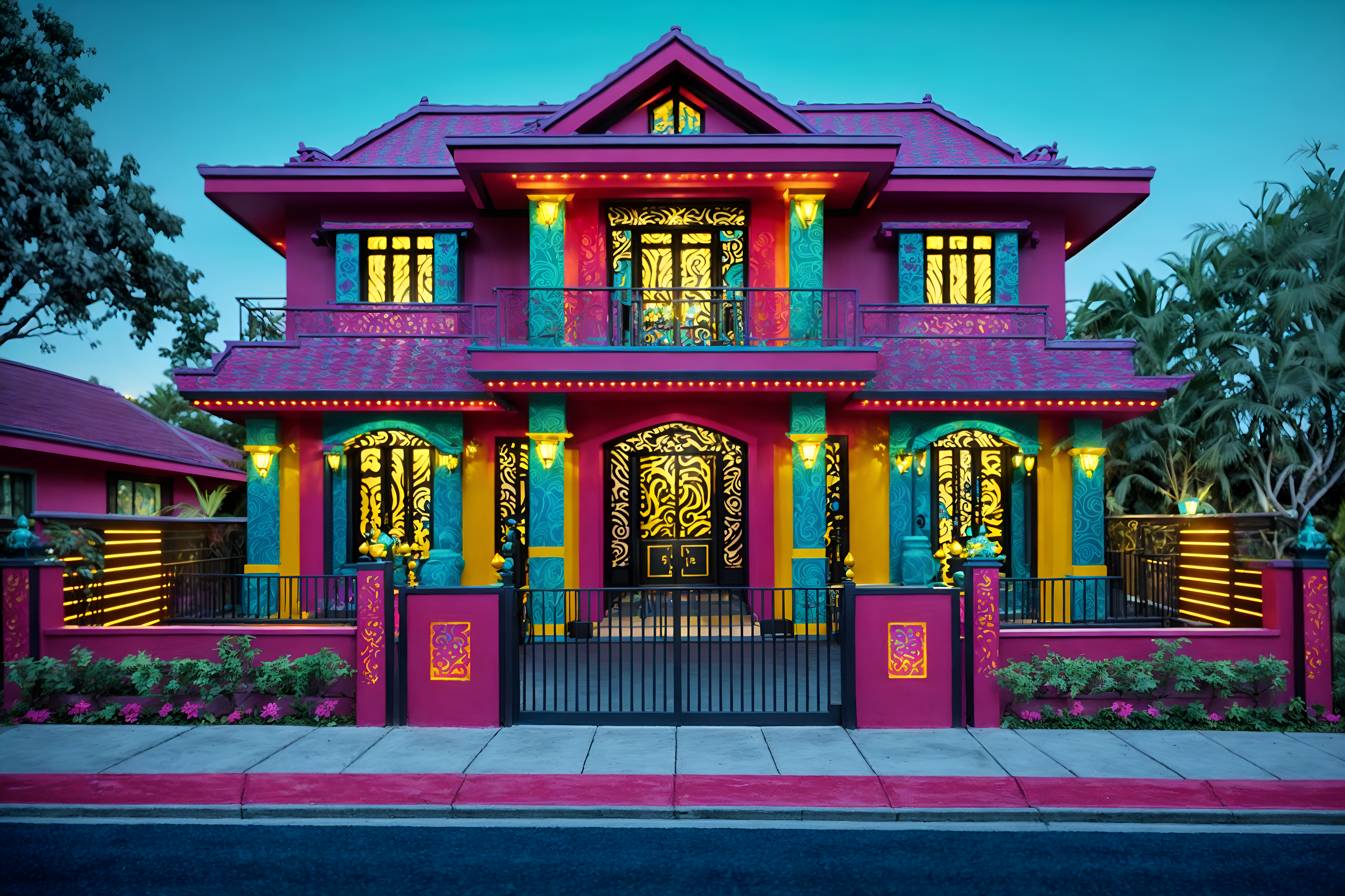photo from pinterest of maximalist-style exterior designed (house exterior exterior) . with more is more philosophy and eye-catching and bold colors and bold patterns and vibrant and bold creativity and playful and over-the-top aesthetic. . cinematic photo, highly detailed, cinematic lighting, ultra-detailed, ultrarealistic, photorealism, 8k. trending on pinterest. maximalist exterior design style. masterpiece, cinematic light, ultrarealistic+, photorealistic+, 8k, raw photo, realistic, sharp focus on eyes, (symmetrical eyes), (intact eyes), hyperrealistic, highest quality, best quality, , highly detailed, masterpiece, best quality, extremely detailed 8k wallpaper, masterpiece, best quality, ultra-detailed, best shadow, detailed background, detailed face, detailed eyes, high contrast, best illumination, detailed face, dulux, caustic, dynamic angle, detailed glow. dramatic lighting. highly detailed, insanely detailed hair, symmetrical, intricate details, professionally retouched, 8k high definition. strong bokeh. award winning photo.