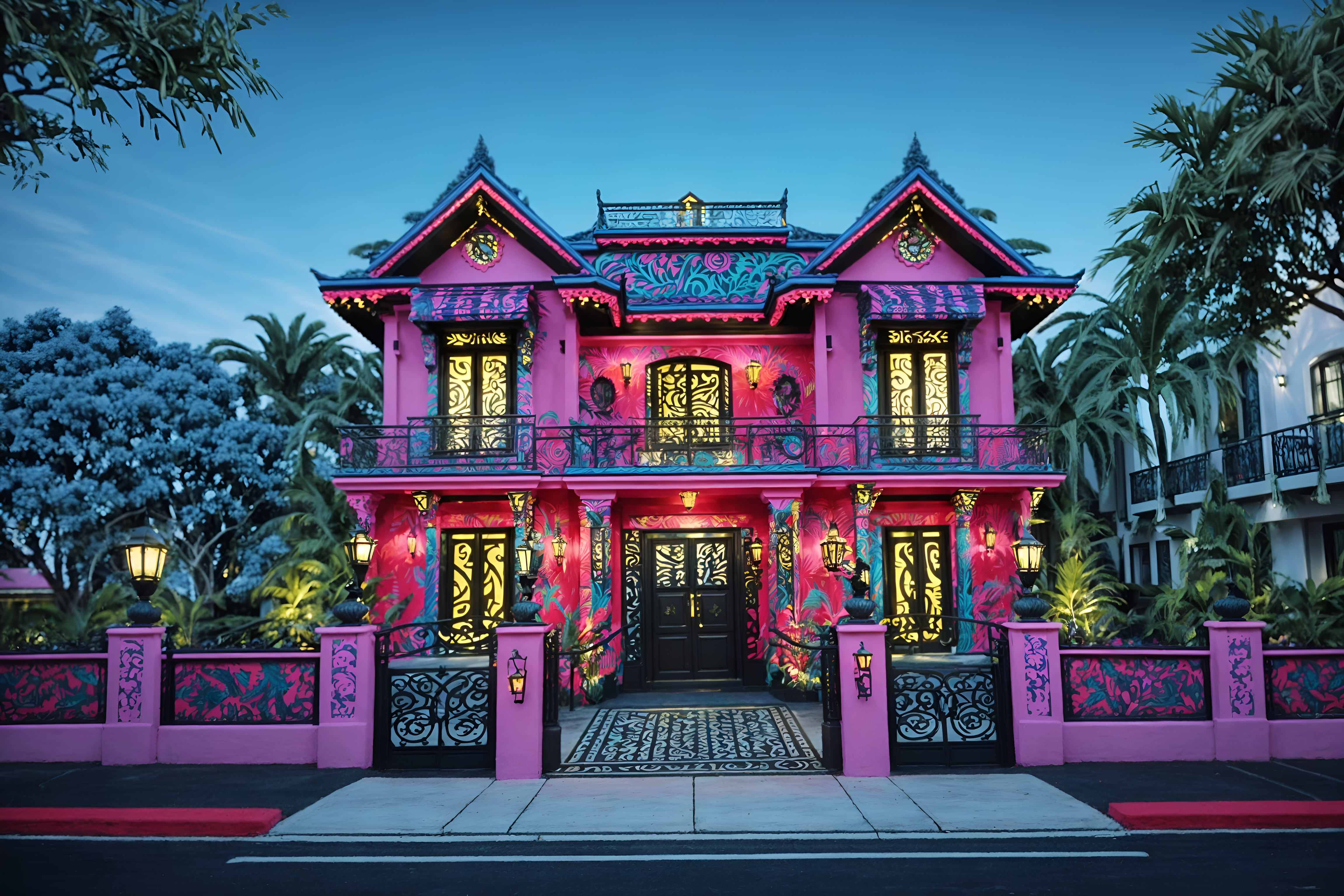 photo from pinterest of maximalist-style exterior designed (house exterior exterior) . with more is more philosophy and eye-catching and bold colors and bold patterns and vibrant and bold creativity and playful and over-the-top aesthetic. . cinematic photo, highly detailed, cinematic lighting, ultra-detailed, ultrarealistic, photorealism, 8k. trending on pinterest. maximalist exterior design style. masterpiece, cinematic light, ultrarealistic+, photorealistic+, 8k, raw photo, realistic, sharp focus on eyes, (symmetrical eyes), (intact eyes), hyperrealistic, highest quality, best quality, , highly detailed, masterpiece, best quality, extremely detailed 8k wallpaper, masterpiece, best quality, ultra-detailed, best shadow, detailed background, detailed face, detailed eyes, high contrast, best illumination, detailed face, dulux, caustic, dynamic angle, detailed glow. dramatic lighting. highly detailed, insanely detailed hair, symmetrical, intricate details, professionally retouched, 8k high definition. strong bokeh. award winning photo.
