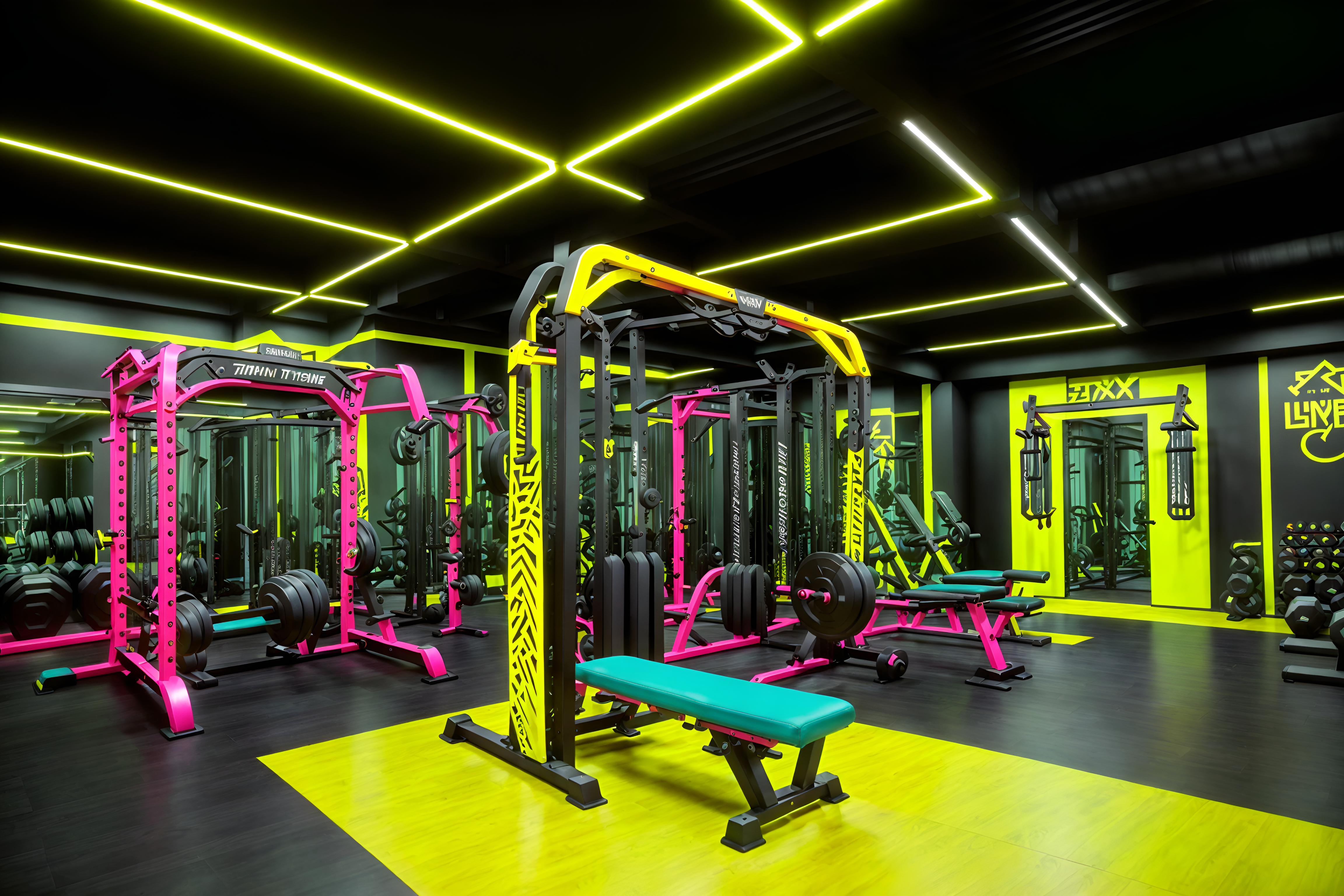 photo from pinterest of maximalist-style interior designed (fitness gym interior) with dumbbell stand and bench press and exercise bicycle and squat rack and crosstrainer and dumbbell stand. . with over-the-top aesthetic and bold design and vibrant and bold patterns and more is more philosophy and bold colors and eye-catching and playful. . cinematic photo, highly detailed, cinematic lighting, ultra-detailed, ultrarealistic, photorealism, 8k. trending on pinterest. maximalist interior design style. masterpiece, cinematic light, ultrarealistic+, photorealistic+, 8k, raw photo, realistic, sharp focus on eyes, (symmetrical eyes), (intact eyes), hyperrealistic, highest quality, best quality, , highly detailed, masterpiece, best quality, extremely detailed 8k wallpaper, masterpiece, best quality, ultra-detailed, best shadow, detailed background, detailed face, detailed eyes, high contrast, best illumination, detailed face, dulux, caustic, dynamic angle, detailed glow. dramatic lighting. highly detailed, insanely detailed hair, symmetrical, intricate details, professionally retouched, 8k high definition. strong bokeh. award winning photo.