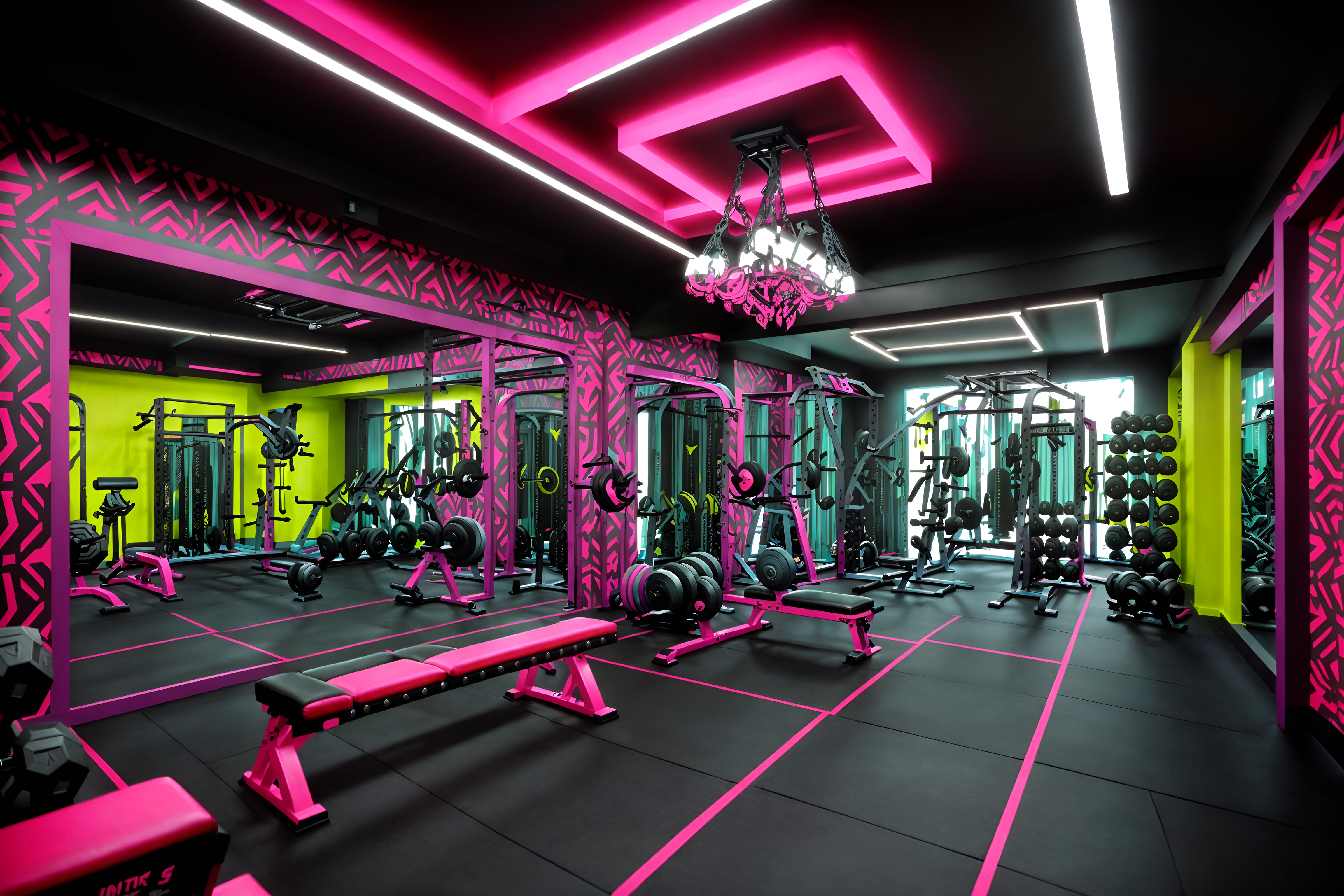 photo from pinterest of maximalist-style interior designed (fitness gym interior) with dumbbell stand and bench press and exercise bicycle and squat rack and crosstrainer and dumbbell stand. . with over-the-top aesthetic and bold design and vibrant and bold patterns and more is more philosophy and bold colors and eye-catching and playful. . cinematic photo, highly detailed, cinematic lighting, ultra-detailed, ultrarealistic, photorealism, 8k. trending on pinterest. maximalist interior design style. masterpiece, cinematic light, ultrarealistic+, photorealistic+, 8k, raw photo, realistic, sharp focus on eyes, (symmetrical eyes), (intact eyes), hyperrealistic, highest quality, best quality, , highly detailed, masterpiece, best quality, extremely detailed 8k wallpaper, masterpiece, best quality, ultra-detailed, best shadow, detailed background, detailed face, detailed eyes, high contrast, best illumination, detailed face, dulux, caustic, dynamic angle, detailed glow. dramatic lighting. highly detailed, insanely detailed hair, symmetrical, intricate details, professionally retouched, 8k high definition. strong bokeh. award winning photo.