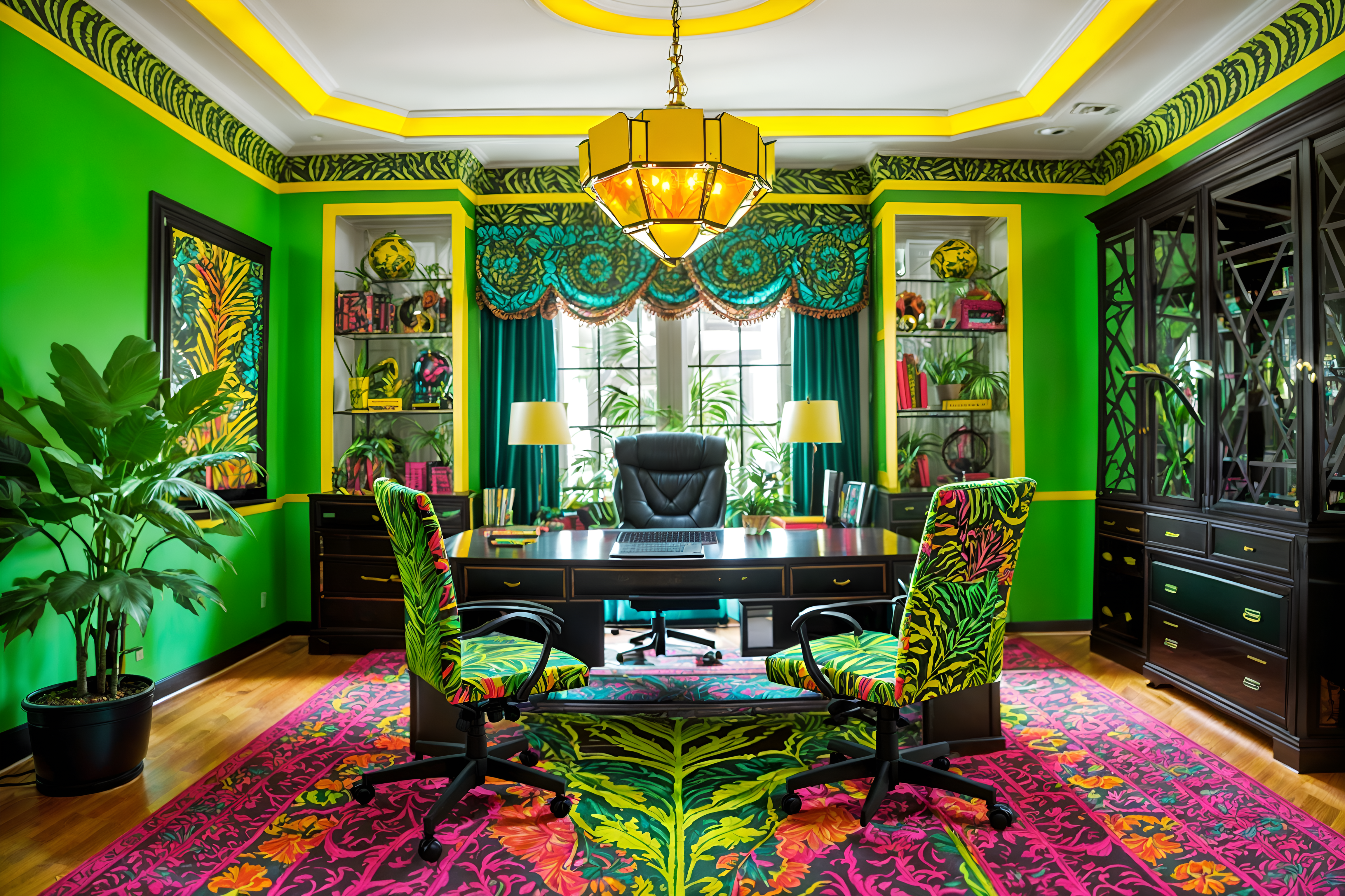 photo from pinterest of maximalist-style interior designed (home office interior) with plant and computer desk and office chair and cabinets and desk lamp and plant. . with over-the-top aesthetic and more is more philosophy and playful and bold creativity and eye-catching and bold patterns and bold colors and vibrant. . cinematic photo, highly detailed, cinematic lighting, ultra-detailed, ultrarealistic, photorealism, 8k. trending on pinterest. maximalist interior design style. masterpiece, cinematic light, ultrarealistic+, photorealistic+, 8k, raw photo, realistic, sharp focus on eyes, (symmetrical eyes), (intact eyes), hyperrealistic, highest quality, best quality, , highly detailed, masterpiece, best quality, extremely detailed 8k wallpaper, masterpiece, best quality, ultra-detailed, best shadow, detailed background, detailed face, detailed eyes, high contrast, best illumination, detailed face, dulux, caustic, dynamic angle, detailed glow. dramatic lighting. highly detailed, insanely detailed hair, symmetrical, intricate details, professionally retouched, 8k high definition. strong bokeh. award winning photo.