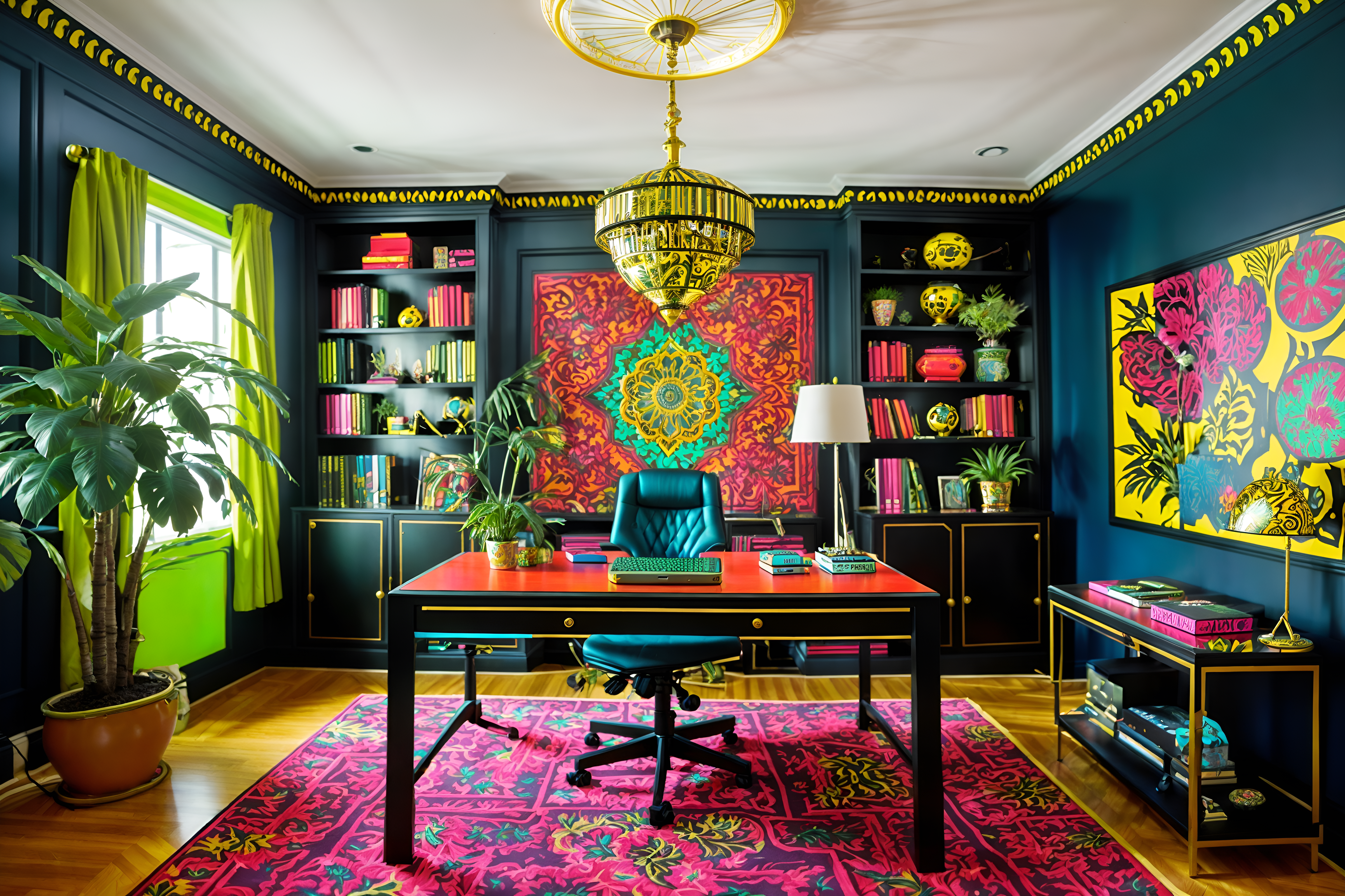 photo from pinterest of maximalist-style interior designed (home office interior) with plant and computer desk and office chair and cabinets and desk lamp and plant. . with over-the-top aesthetic and more is more philosophy and playful and bold creativity and eye-catching and bold patterns and bold colors and vibrant. . cinematic photo, highly detailed, cinematic lighting, ultra-detailed, ultrarealistic, photorealism, 8k. trending on pinterest. maximalist interior design style. masterpiece, cinematic light, ultrarealistic+, photorealistic+, 8k, raw photo, realistic, sharp focus on eyes, (symmetrical eyes), (intact eyes), hyperrealistic, highest quality, best quality, , highly detailed, masterpiece, best quality, extremely detailed 8k wallpaper, masterpiece, best quality, ultra-detailed, best shadow, detailed background, detailed face, detailed eyes, high contrast, best illumination, detailed face, dulux, caustic, dynamic angle, detailed glow. dramatic lighting. highly detailed, insanely detailed hair, symmetrical, intricate details, professionally retouched, 8k high definition. strong bokeh. award winning photo.