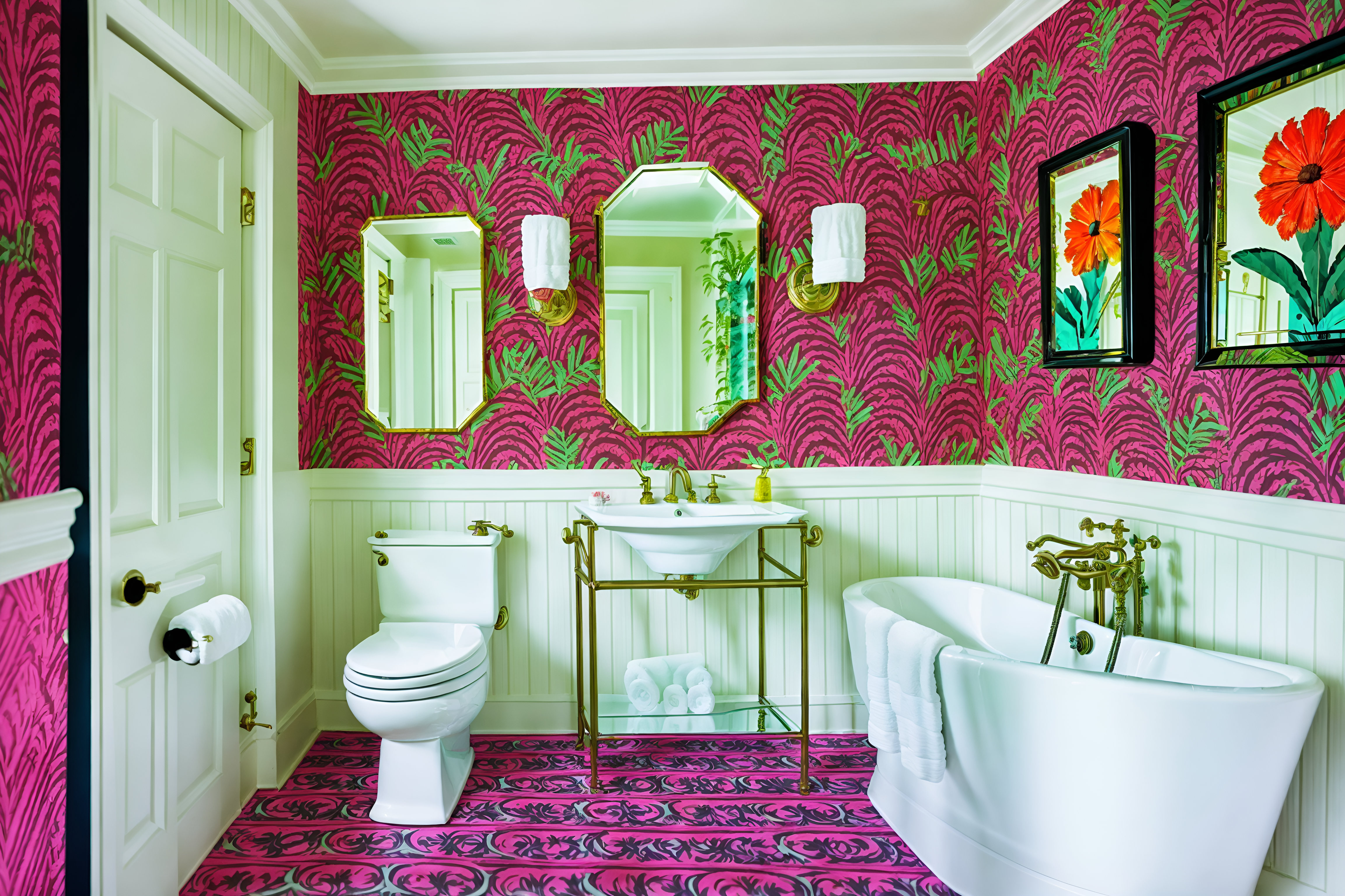 photo from pinterest of maximalist-style interior designed (hotel bathroom interior) with bathroom cabinet and mirror and waste basket and bathroom sink with faucet and bathtub and shower and plant and toilet seat. . with bold patterns and bold colors and more is more philosophy and eye-catching and over-the-top aesthetic and bold creativity and playful and bold design. . cinematic photo, highly detailed, cinematic lighting, ultra-detailed, ultrarealistic, photorealism, 8k. trending on pinterest. maximalist interior design style. masterpiece, cinematic light, ultrarealistic+, photorealistic+, 8k, raw photo, realistic, sharp focus on eyes, (symmetrical eyes), (intact eyes), hyperrealistic, highest quality, best quality, , highly detailed, masterpiece, best quality, extremely detailed 8k wallpaper, masterpiece, best quality, ultra-detailed, best shadow, detailed background, detailed face, detailed eyes, high contrast, best illumination, detailed face, dulux, caustic, dynamic angle, detailed glow. dramatic lighting. highly detailed, insanely detailed hair, symmetrical, intricate details, professionally retouched, 8k high definition. strong bokeh. award winning photo.