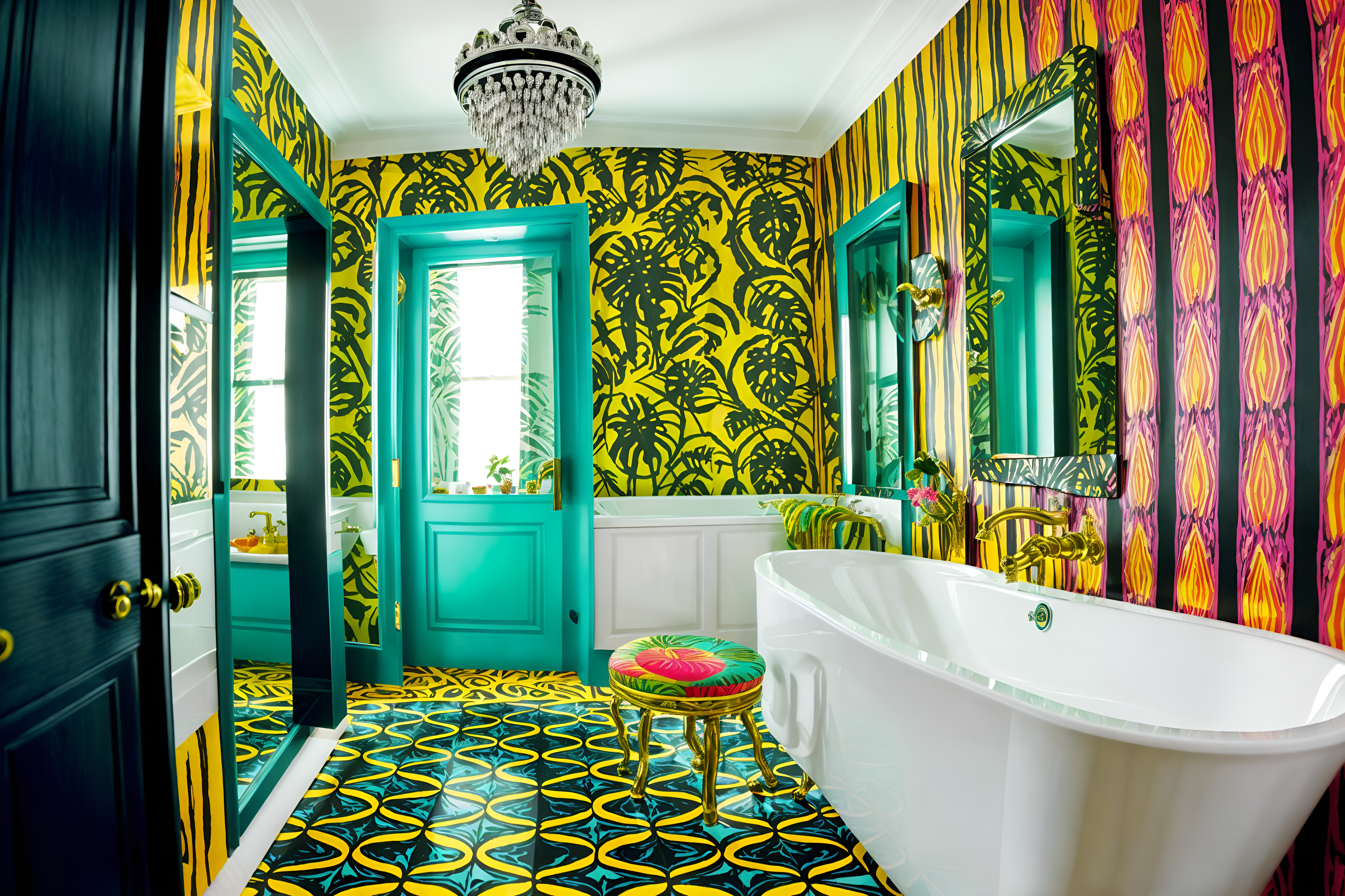photo from pinterest of maximalist-style interior designed (hotel bathroom interior) with bathroom cabinet and mirror and waste basket and bathroom sink with faucet and bathtub and shower and plant and toilet seat. . with bold patterns and bold colors and more is more philosophy and eye-catching and over-the-top aesthetic and bold creativity and playful and bold design. . cinematic photo, highly detailed, cinematic lighting, ultra-detailed, ultrarealistic, photorealism, 8k. trending on pinterest. maximalist interior design style. masterpiece, cinematic light, ultrarealistic+, photorealistic+, 8k, raw photo, realistic, sharp focus on eyes, (symmetrical eyes), (intact eyes), hyperrealistic, highest quality, best quality, , highly detailed, masterpiece, best quality, extremely detailed 8k wallpaper, masterpiece, best quality, ultra-detailed, best shadow, detailed background, detailed face, detailed eyes, high contrast, best illumination, detailed face, dulux, caustic, dynamic angle, detailed glow. dramatic lighting. highly detailed, insanely detailed hair, symmetrical, intricate details, professionally retouched, 8k high definition. strong bokeh. award winning photo.