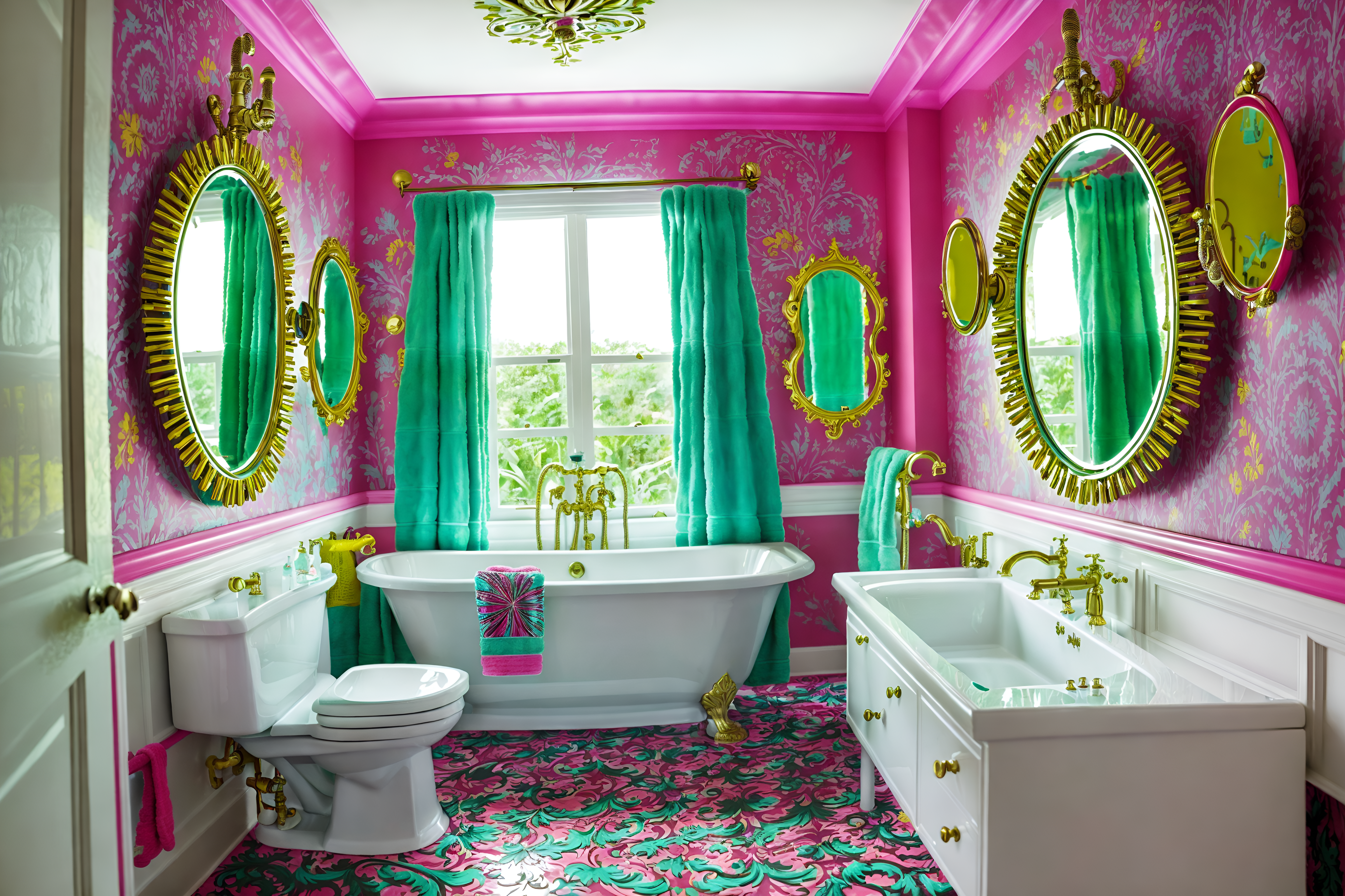 photo from pinterest of maximalist-style interior designed (hotel bathroom interior) with bathtub and bathroom cabinet and bath towel and waste basket and bath rail and mirror and shower and bathroom sink with faucet. . with bold design and eye-catching and bold colors and bold creativity and over-the-top aesthetic and more is more philosophy and vibrant and bold patterns. . cinematic photo, highly detailed, cinematic lighting, ultra-detailed, ultrarealistic, photorealism, 8k. trending on pinterest. maximalist interior design style. masterpiece, cinematic light, ultrarealistic+, photorealistic+, 8k, raw photo, realistic, sharp focus on eyes, (symmetrical eyes), (intact eyes), hyperrealistic, highest quality, best quality, , highly detailed, masterpiece, best quality, extremely detailed 8k wallpaper, masterpiece, best quality, ultra-detailed, best shadow, detailed background, detailed face, detailed eyes, high contrast, best illumination, detailed face, dulux, caustic, dynamic angle, detailed glow. dramatic lighting. highly detailed, insanely detailed hair, symmetrical, intricate details, professionally retouched, 8k high definition. strong bokeh. award winning photo.