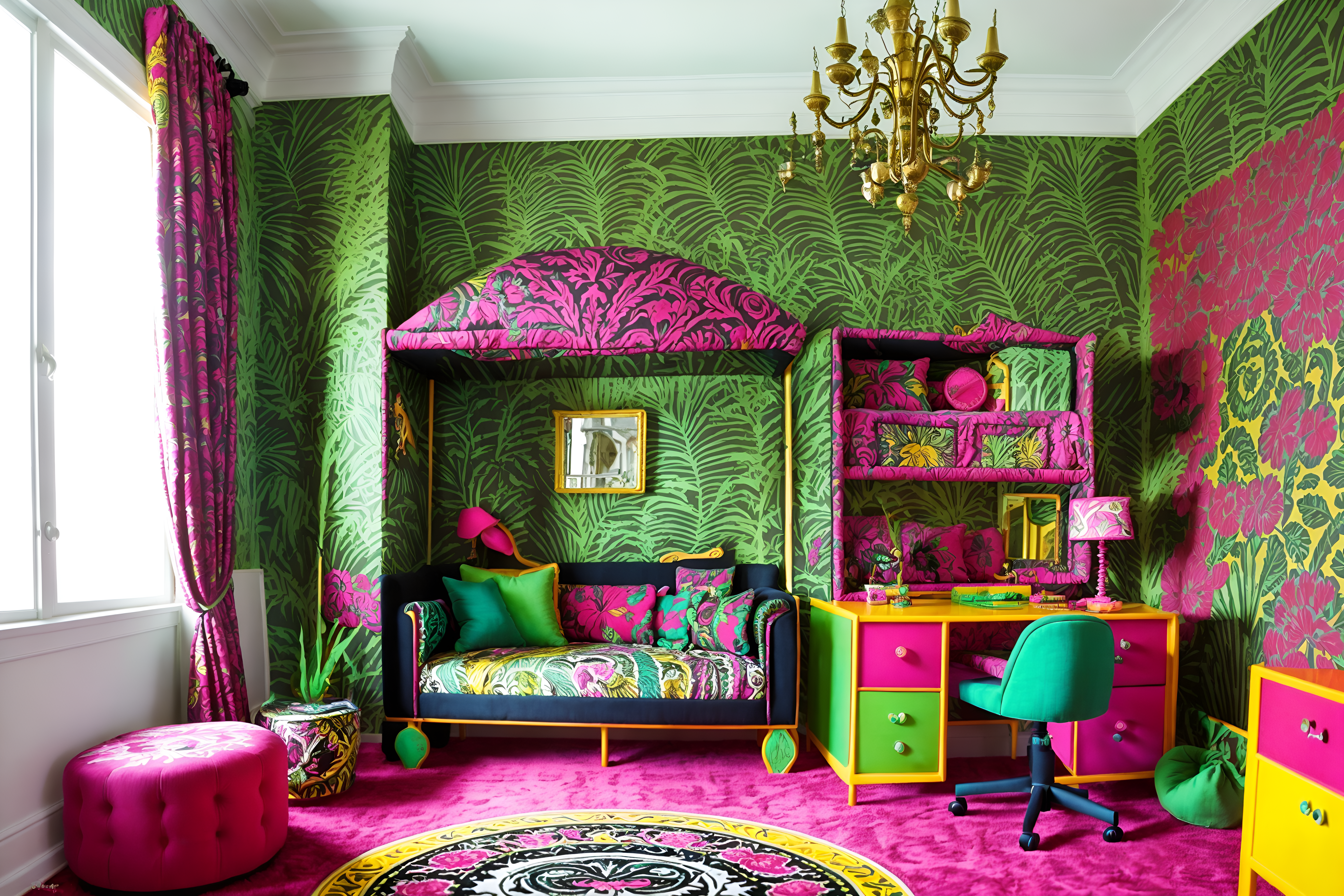 photo from pinterest of maximalist-style interior designed (kids room interior) with plant and accent chair and mirror and bed and headboard and night light and kids desk and storage bench or ottoman. . with more is more philosophy and over-the-top aesthetic and eye-catching and bold patterns and bold design and bold colors and playful and bold creativity. . cinematic photo, highly detailed, cinematic lighting, ultra-detailed, ultrarealistic, photorealism, 8k. trending on pinterest. maximalist interior design style. masterpiece, cinematic light, ultrarealistic+, photorealistic+, 8k, raw photo, realistic, sharp focus on eyes, (symmetrical eyes), (intact eyes), hyperrealistic, highest quality, best quality, , highly detailed, masterpiece, best quality, extremely detailed 8k wallpaper, masterpiece, best quality, ultra-detailed, best shadow, detailed background, detailed face, detailed eyes, high contrast, best illumination, detailed face, dulux, caustic, dynamic angle, detailed glow. dramatic lighting. highly detailed, insanely detailed hair, symmetrical, intricate details, professionally retouched, 8k high definition. strong bokeh. award winning photo.