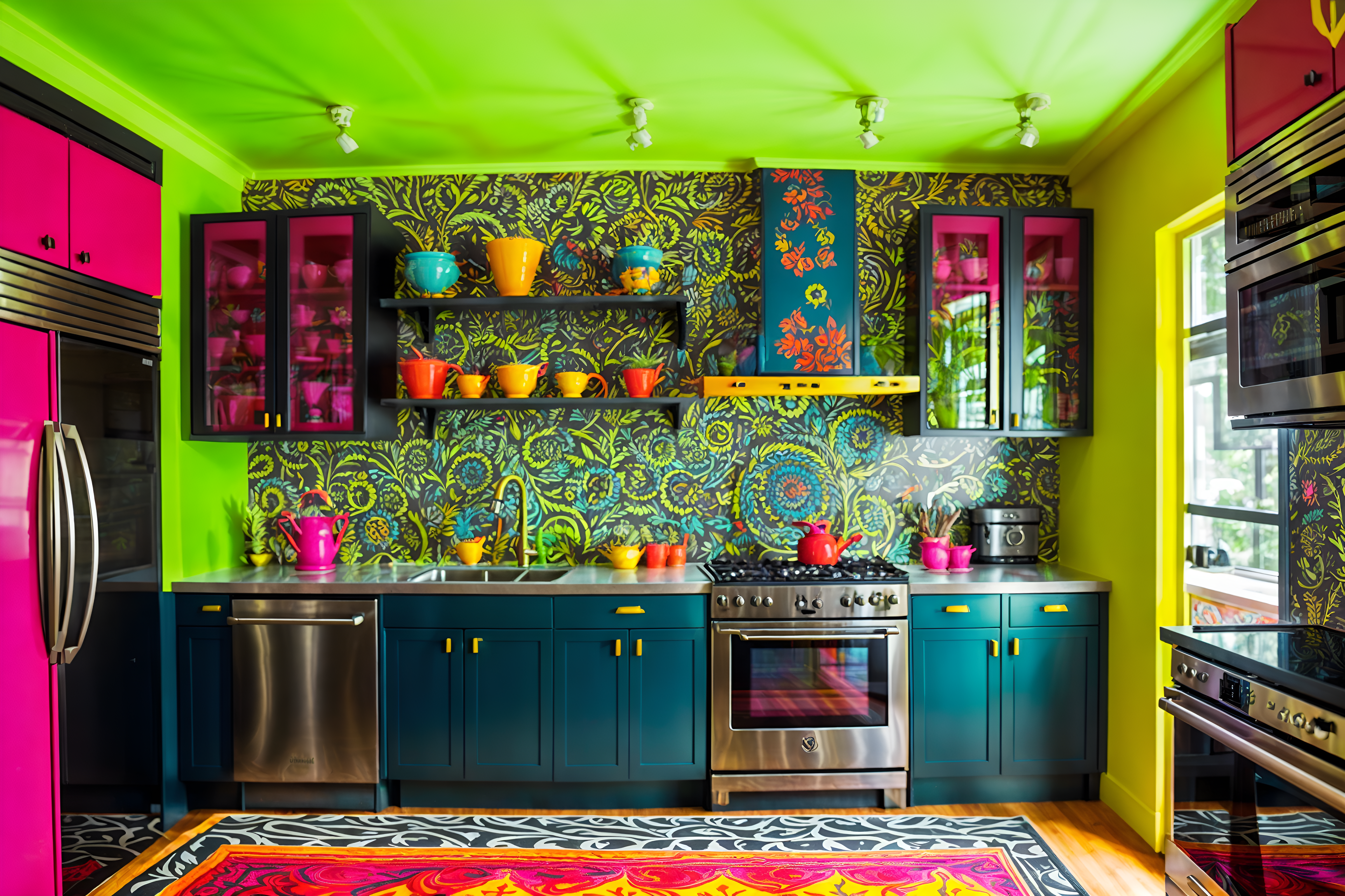 photo from pinterest of maximalist-style interior designed (kitchen interior) with plant and stove and refrigerator and worktops and sink and kitchen cabinets and plant. . with bold design and more is more philosophy and vibrant and eye-catching and bold patterns and over-the-top aesthetic and bold colors and playful. . cinematic photo, highly detailed, cinematic lighting, ultra-detailed, ultrarealistic, photorealism, 8k. trending on pinterest. maximalist interior design style. masterpiece, cinematic light, ultrarealistic+, photorealistic+, 8k, raw photo, realistic, sharp focus on eyes, (symmetrical eyes), (intact eyes), hyperrealistic, highest quality, best quality, , highly detailed, masterpiece, best quality, extremely detailed 8k wallpaper, masterpiece, best quality, ultra-detailed, best shadow, detailed background, detailed face, detailed eyes, high contrast, best illumination, detailed face, dulux, caustic, dynamic angle, detailed glow. dramatic lighting. highly detailed, insanely detailed hair, symmetrical, intricate details, professionally retouched, 8k high definition. strong bokeh. award winning photo.