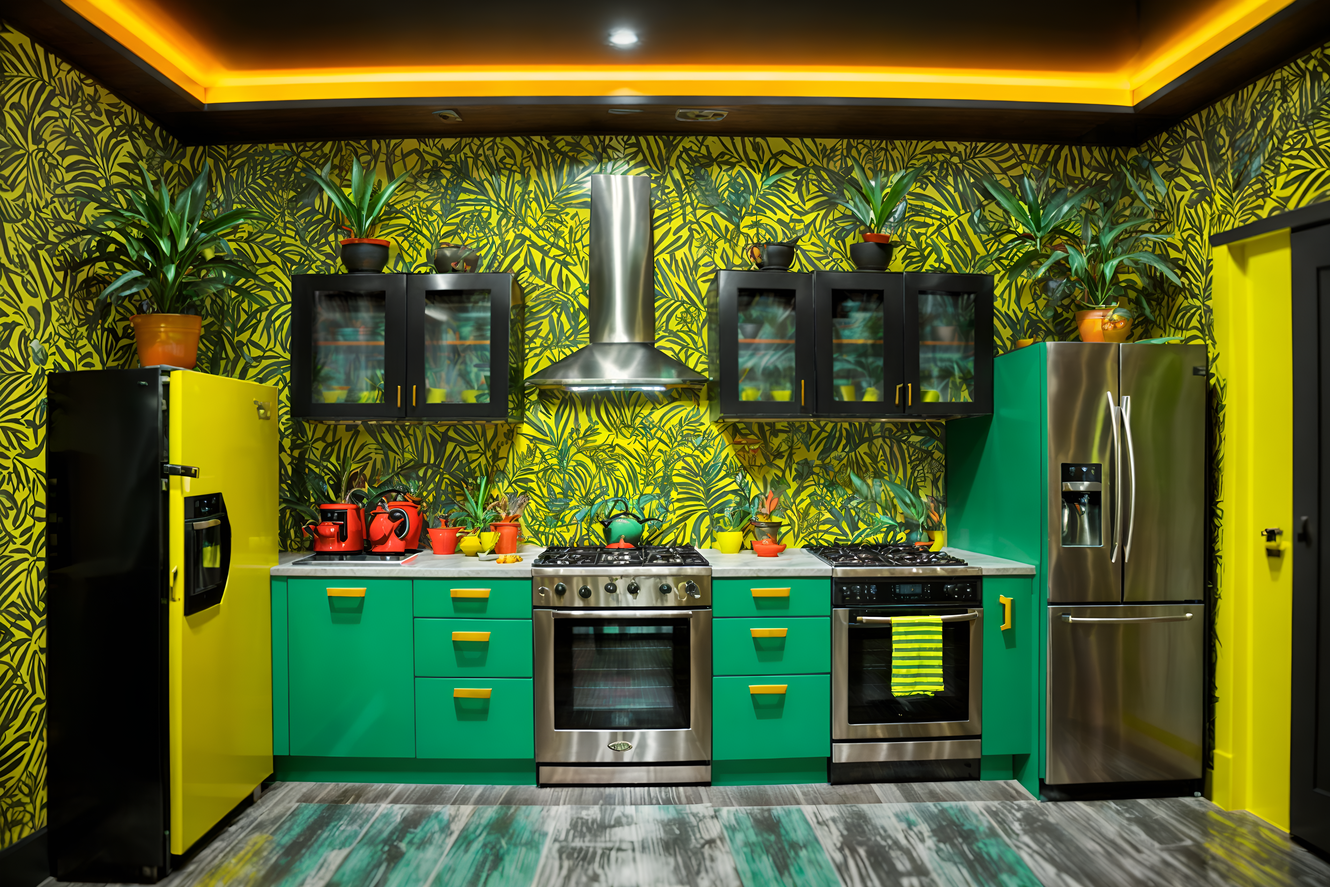 photo from pinterest of maximalist-style interior designed (kitchen interior) with plant and stove and refrigerator and worktops and sink and kitchen cabinets and plant. . with bold design and more is more philosophy and vibrant and eye-catching and bold patterns and over-the-top aesthetic and bold colors and playful. . cinematic photo, highly detailed, cinematic lighting, ultra-detailed, ultrarealistic, photorealism, 8k. trending on pinterest. maximalist interior design style. masterpiece, cinematic light, ultrarealistic+, photorealistic+, 8k, raw photo, realistic, sharp focus on eyes, (symmetrical eyes), (intact eyes), hyperrealistic, highest quality, best quality, , highly detailed, masterpiece, best quality, extremely detailed 8k wallpaper, masterpiece, best quality, ultra-detailed, best shadow, detailed background, detailed face, detailed eyes, high contrast, best illumination, detailed face, dulux, caustic, dynamic angle, detailed glow. dramatic lighting. highly detailed, insanely detailed hair, symmetrical, intricate details, professionally retouched, 8k high definition. strong bokeh. award winning photo.