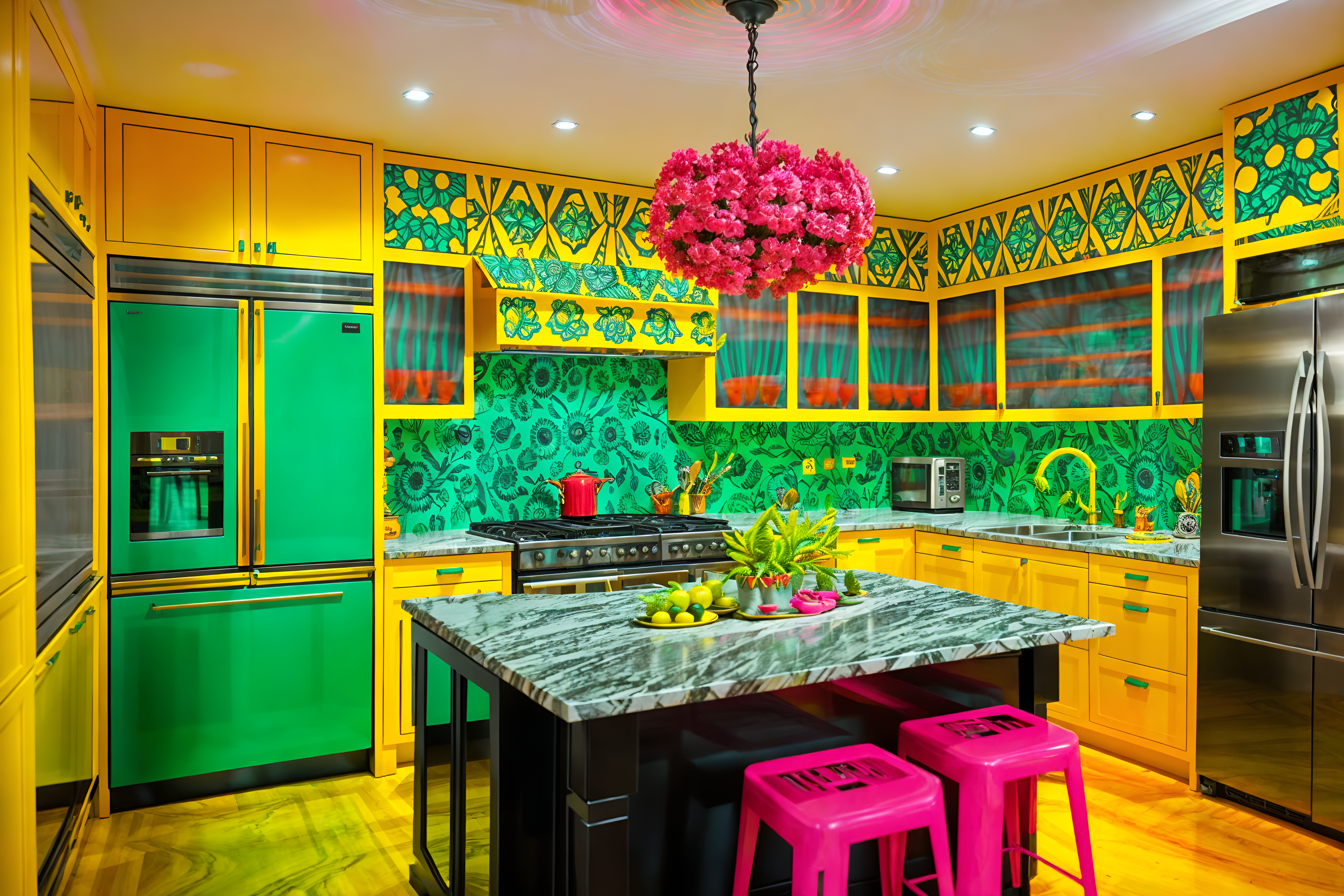 photo from pinterest of maximalist-style interior designed (kitchen interior) with sink and stove and worktops and refrigerator and kitchen cabinets and plant and sink. . with bold design and eye-catching and more is more philosophy and bold colors and vibrant and over-the-top aesthetic and playful and bold patterns. . cinematic photo, highly detailed, cinematic lighting, ultra-detailed, ultrarealistic, photorealism, 8k. trending on pinterest. maximalist interior design style. masterpiece, cinematic light, ultrarealistic+, photorealistic+, 8k, raw photo, realistic, sharp focus on eyes, (symmetrical eyes), (intact eyes), hyperrealistic, highest quality, best quality, , highly detailed, masterpiece, best quality, extremely detailed 8k wallpaper, masterpiece, best quality, ultra-detailed, best shadow, detailed background, detailed face, detailed eyes, high contrast, best illumination, detailed face, dulux, caustic, dynamic angle, detailed glow. dramatic lighting. highly detailed, insanely detailed hair, symmetrical, intricate details, professionally retouched, 8k high definition. strong bokeh. award winning photo.